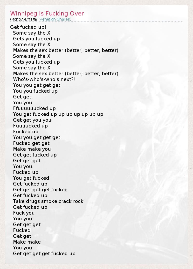 Get fucked up! Some say the X Gets you fucked up Some say the X Makes the sex better (better, better, better) Some say the X Gets you fucked up Some say the X Makes the sex better (better, better, better) Who's-who's-who's next?! You you get get get You you fucked up Get get You you Ffuuuuuucked up You get fucked up up up up up up up Get get you you Fuuuucked up Fucked up You you get get get Fucked get get Make make you Get get fucked up Get get get You you Fucked up You get fucked Get fucked up Get get get get fucked Get fucked up Take drugs smoke crack rock Get fucked up Fuck you You you Get get get Fucked Get get Make make You you Get get get get fucked up