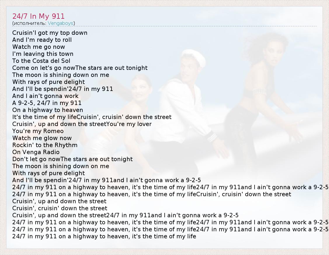Cruisin'I got my top down And I'm ready to roll Watch me go now I'm leaving this town To the Costa del Sol Come on let's go nowThe stars are out tonight The moon is shining down on me With rays of pure delight And I'll be spendin'24/7 in my 911 And I ain't gonna work A 9-2-5, 24/7 in my 911 On a highway to heaven It's the time of my lifeCruisin', cruisin' down the street Cruisin', up and down the streetYou're my lover You're my Romeo Watch me glow now Rockin' to the Rhythm On Venga Radio Don't let go nowThe stars are out tonight The moon is shining down on me With rays of pure delight And I'll be spendin'24/7 in my 911and I ain't gonna work a 9-2-5 24/7 in my 911 on a highway to heaven, it's the time of my life24/7 in my 911and I ain't gonna work a 9-2-5 24/7 in my 911 on a highway to heaven, it's the time of my lifeCruisin', cruisin' down the street Cruisin', up and down the street Cruisin', cruisin' down the street Cruisin', up and down the street24/7 in my 911and I ain't gonna work a 9-2-5 24/7 in my 911 on a highway to heaven, it's the time of my life24/7 in my 911and I ain't gonna work a 9-2-5 24/7 in my 911 on a highway to heaven, it's the time of my life24/7 in my 911and I ain't gonna work a 9-2-5 24/7 in my 911 on a highway to heaven, it's the time of my life