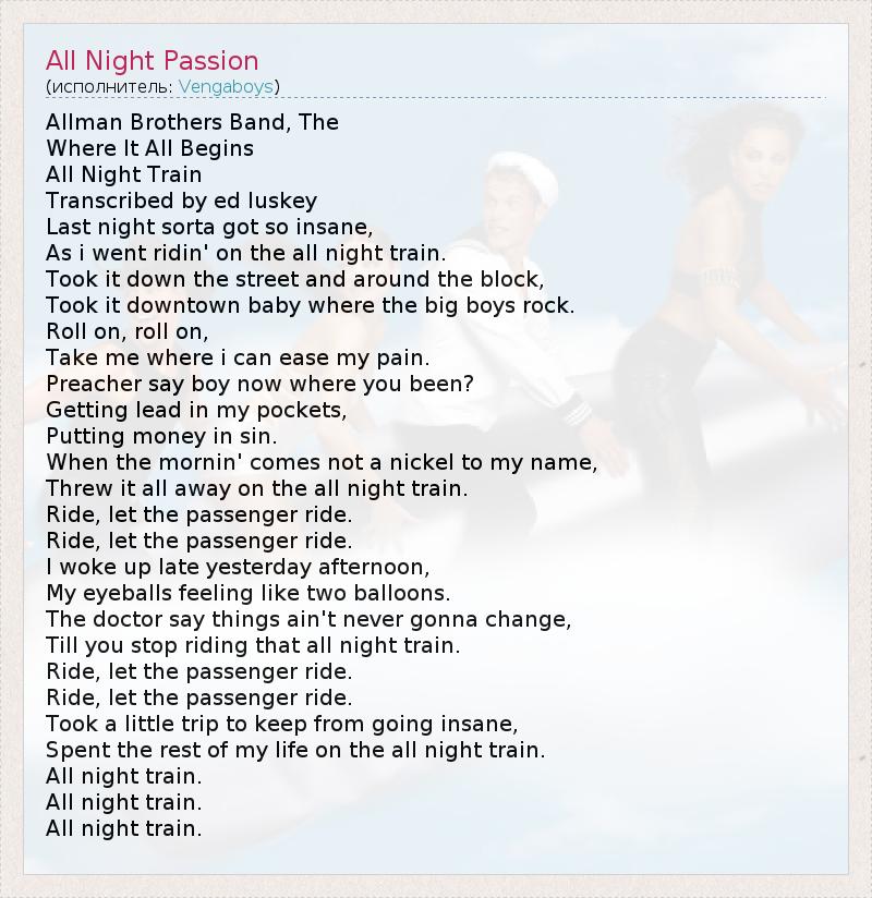 Allman Brothers Band, The Where It All Begins All Night Train Transcribed by ed luskey Last night sorta got so insane, As i went ridin' on the all night train. Took it down the street and around the block, Took it downtown baby where the big boys rock. Roll on, roll on, Take me where i can ease my pain. Preacher say boy now where you been? Getting lead in my pockets, Putting money in sin. When the mornin' comes not a nickel to my name, Threw it all away on the all night train. Ride, let the passenger ride. Ride, let the passenger ride. I woke up late yesterday afternoon, My eyeballs feeling like two balloons. The doctor say things ain't never gonna change, Till you stop riding that all night train. Ride, let the passenger ride. Ride, let the passenger ride. Took a little trip to keep from going insane, Spent the rest of my life on the all night train. All night train. All night train. All night train.
