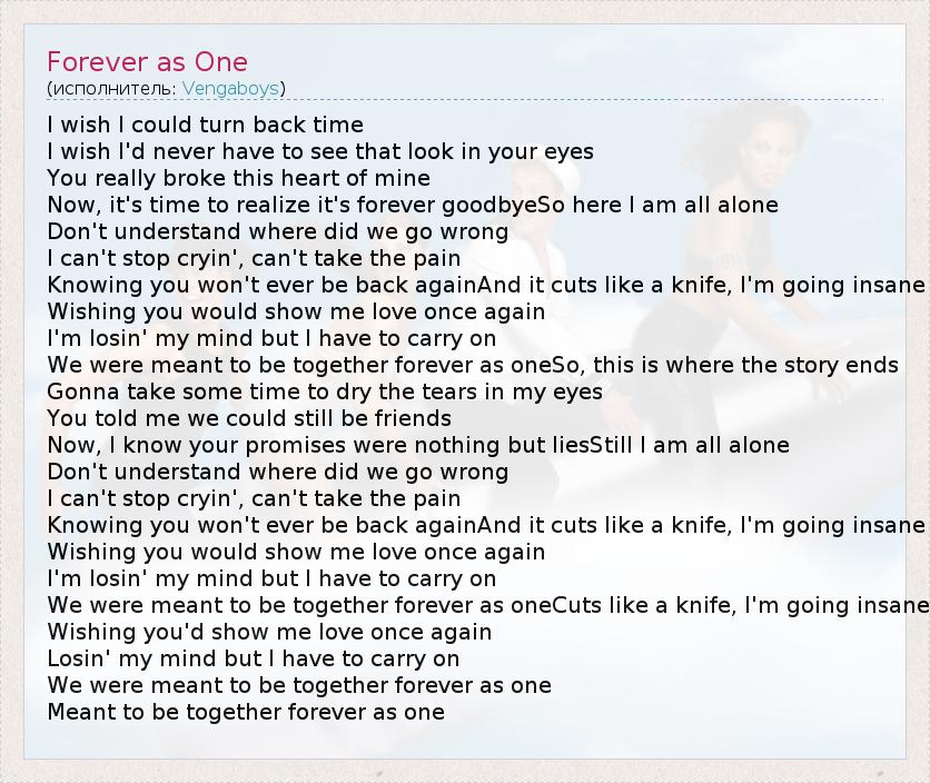 I wish I could turn back time I wish I'd never have to see that look in your eyes You really broke this heart of mine Now, it's time to realize it's forever goodbyeSo here I am all alone Don't understand where did we go wrong I can't stop cryin', can't take the pain Knowing you won't ever be back againAnd it cuts like a knife, I'm going insane Wishing you would show me love once again I'm losin' my mind but I have to carry on We were meant to be together forever as oneSo, this is where the story ends Gonna take some time to dry the tears in my eyes You told me we could still be friends Now, I know your promises were nothing but liesStill I am all alone Don't understand where did we go wrong I can't stop cryin', can't take the pain Knowing you won't ever be back againAnd it cuts like a knife, I'm going insane Wishing you would show me love once again I'm losin' my mind but I have to carry on We were meant to be together forever as oneCuts like a knife, I'm going insane Wishing you'd show me love once again Losin' my mind but I have to carry on We were meant to be together forever as one Meant to be together forever as one