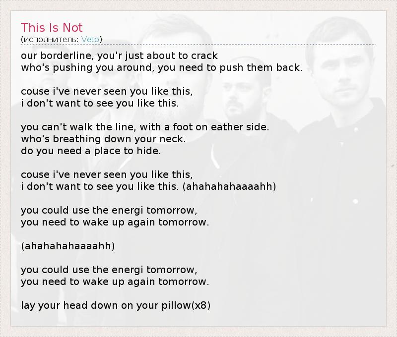 our borderline, you'r just about to crack who's pushing you around, you need to push them back. couse i've never seen you like this, i don't want to see you like this. you can't walk the line, with a foot on eather side. who's breathing down your neck. do you need a place to hide. couse i've never seen you like this, i don't want to see you like this. (ahahahahaaaahh) you could use the energi tomorrow, you need to wake up again tomorrow. (ahahahahaaaahh) you could use the energi tomorrow, you need to wake up again tomorrow. lay your head down on your pillow(x8)