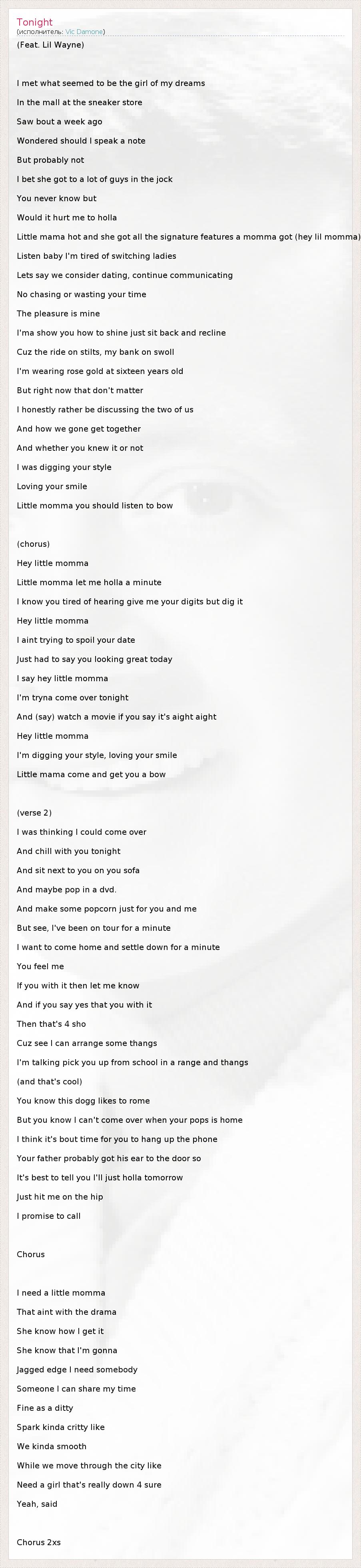 (Feat. Lil Wayne) I met what seemed to be the girl of my dreams In the mall at the sneaker store Saw bout a week ago Wondered should I speak a note But probably not I bet she got to a lot of guys in the jock You never know but Would it hurt me to holla Little mama hot and she got all the signature features a momma got (hey lil momma) Listen baby I'm tired of switching ladies Lets say we consider dating, continue communicating No chasing or wasting your time The pleasure is mine I'ma show you how to shine just sit back and recline Cuz the ride on stilts, my bank on swoll I'm wearing rose gold at sixteen years old But right now that don't matter I honestly rather be discussing the two of us And how we gone get together And whether you knew it or not I was digging your style Loving your smile Little momma you should listen to bow (chorus) Hey little momma Little momma let me holla a minute I know you tired of hearing give me your digits but dig it Hey little momma I aint trying to spoil your date Just had to say you looking great today I say hey little momma I'm tryna come over tonight And (say) watch a movie if you say it's aight aight Hey little momma I'm digging your style, loving your smile Little mama come and get you a bow (verse 2) I was thinking I could come over And chill with you tonight And sit next to you on you sofa And maybe pop in a dvd. And make some popcorn just for you and me But see, I've been on tour for a minute I want to come home and settle down for a minute You feel me If you with it then let me know And if you say yes that you with it Then that's 4 sho Cuz see I can arrange some thangs I'm talking pick you up from school in a range and thangs (and that's cool) You know this dogg likes to rome But you know I can't come over when your pops is home I think it's bout time for you to hang up the phone Your father probably got his ear to the door so It's best to tell you I'll just holla tomorrow Just hit me on the hip I promise to call Chorus I need a little momma That aint with the drama She know how I get it She know that I'm gonna Jagged edge I need somebody Someone I can share my time Fine as a ditty Spark kinda critty like We kinda smooth While we move through the city like Need a girl that's really down 4 sure Yeah, said Chorus 2xs