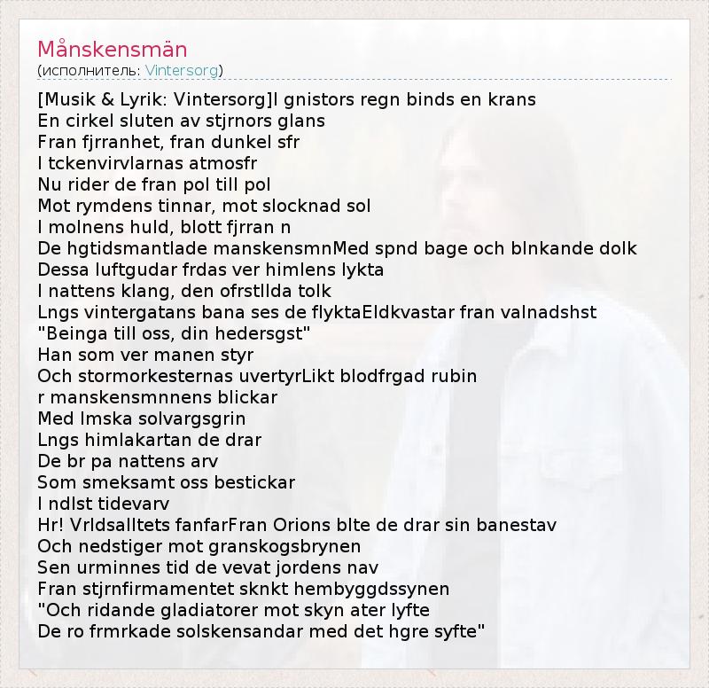 Это интересно:Vintersorg — шведская викинг/фолк/прогрессив-метал-группа.Образовалась в 1994 г. в городе Шеллефтео и первоначально носила название «Волчий трон» (швед. «Vargatron»). Первоначально участники ставили перед собой задачу расширить музыкальные границы блэк-метала, для чего использовались элементы фольклора. Состав коллектива часто менялся и в 1996 г. вокалист и гитарист Андреас Хедлунд (Andreas Hedlund)... продолжение