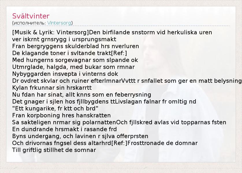 Это интересно:Vintersorg — шведская викинг/фолк/прогрессив-метал-группа.Образовалась в 1994 г. в городе Шеллефтео и первоначально носила название «Волчий трон» (швед. «Vargatron»). Первоначально участники ставили перед собой задачу расширить музыкальные границы блэк-метала, для чего использовались элементы фольклора. Состав коллектива часто менялся и в 1996 г. вокалист и гитарист Андреас Хедлунд (Andreas Hedlund)... продолжение