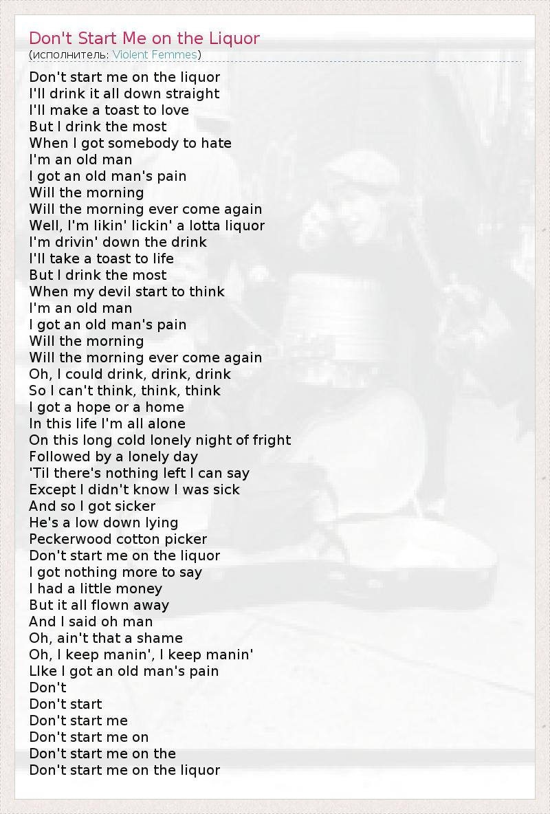 Don't start me on the liquor I'll drink it all down straight I'll make a toast to love But I drink the most When I got somebody to hate I'm an old man I got an old man's pain Will the morning Will the morning ever come again Well, I'm likin' lickin' a lotta liquor I'm drivin' down the drink I'll take a toast to life But I drink the most When my devil start to think I'm an old man I got an old man's pain Will the morning Will the morning ever come again Oh, I could drink, drink, drink So I can't think, think, think I got a hope or a home In this life I'm all alone On this long cold lonely night of fright Followed by a lonely day 'Til there's nothing left I can say Except I didn't know I was sick And so I got sicker He's a low down lying Peckerwood cotton picker Don't start me on the liquor I got nothing more to say I had a little money But it all flown away And I said oh man Oh, ain't that a shame Oh, I keep manin', I keep manin' LIke I got an old man's pain Don't Don't start Don't start me Don't start me on Don't start me on the Don't start me on the liquor