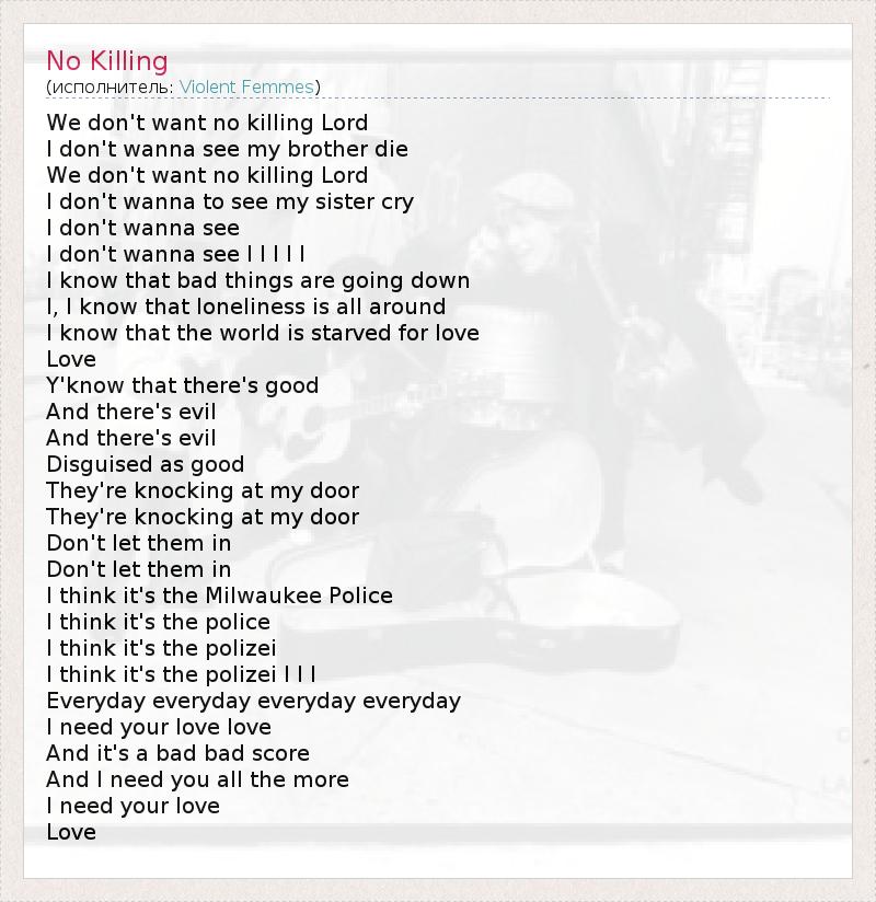 We don't want no killing Lord I don't wanna see my brother die We don't want no killing Lord I don't wanna to see my sister cry I don't wanna see I don't wanna see I I I I I I know that bad things are going down I, I know that loneliness is all around I know that the world is starved for love Love Y'know that there's good And there's evil And there's evil Disguised as good They're knocking at my door They're knocking at my door Don't let them in Don't let them in I think it's the Milwaukee Police I think it's the police I think it's the polizei I think it's the polizei I I I Everyday everyday everyday everyday I need your love love And it's a bad bad score And I need you all the more I need your love Love