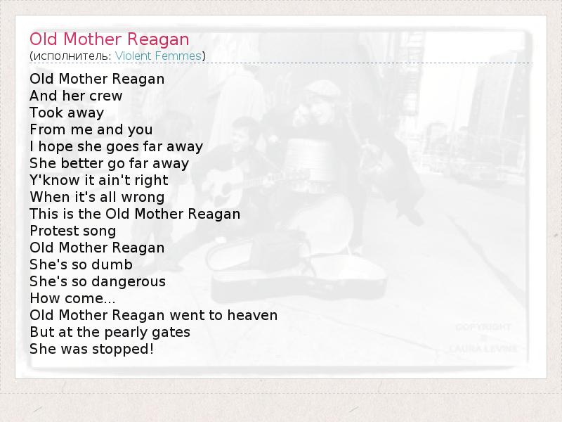 А как ты думаешь, о чем песня "Old Mother Reagan" ?