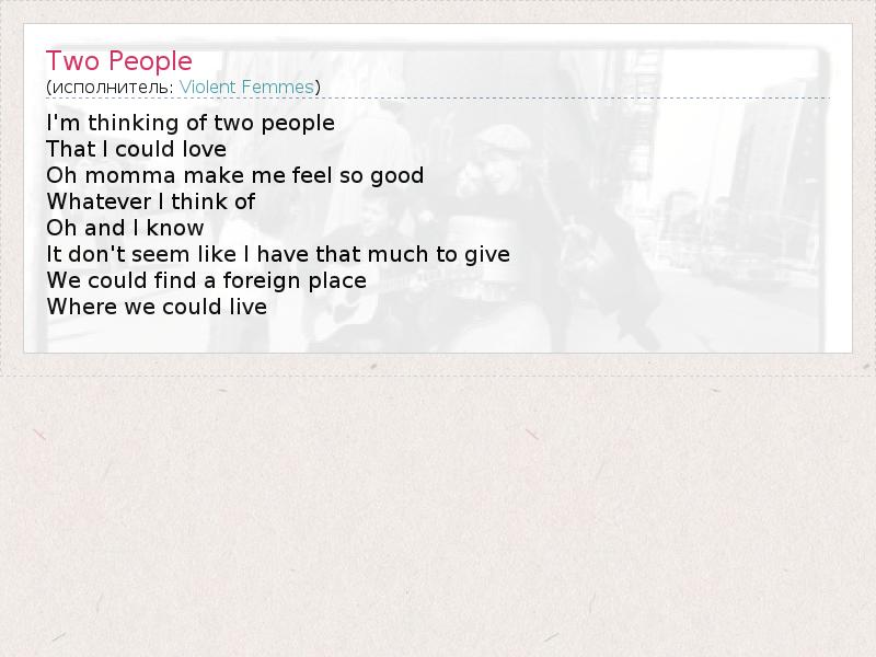 I'm thinking of two people That I could love Oh momma make me feel so good Whatever I think of Oh and I know It don't seem like I have that much to give We could find a foreign place Where we could live
