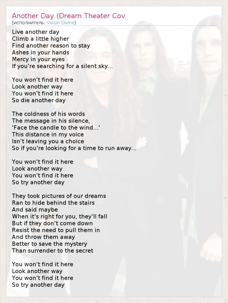 Проживи еще один день, Поднимись чуть выше, Найди еще одну причину, чтобы остаться. Пепел в твоих руках, Сочувствие в твоих глазах, Если ты ищешь спокойного неба... Ты не найдешь этого здесь, Попробуй выбрать другой путь. Ты не найдешь этого здесь, Так умри в другой день. Холод его слов, Послание в его молчании, "Поверни свечу по ветру..." Эта сдержанность в моем голосе Не оставляет тебе выбора. Так если ты ищешь шанса убежать прочь... Ты не найдешь этого здесь, Попробуй выбрать другой путь. Ты не найдешь этого здесь, Так умри в другой день. Они вырывали образы из наших снов, Бежали прятаться за лестницу И говорили, что, возможно, Когда придет время, они уйдут. Но если они не спустятся вниз, Сопротивляясь тому, что ты их отталкиваешь И выбрасываешь из головы, Лучше сохранить тайну, Чем ей поддаться. Ты не найдешь этого здесь, Попробуй выбрать другой путь. Ты не найдешь этого здесь, Так умри в другой день.