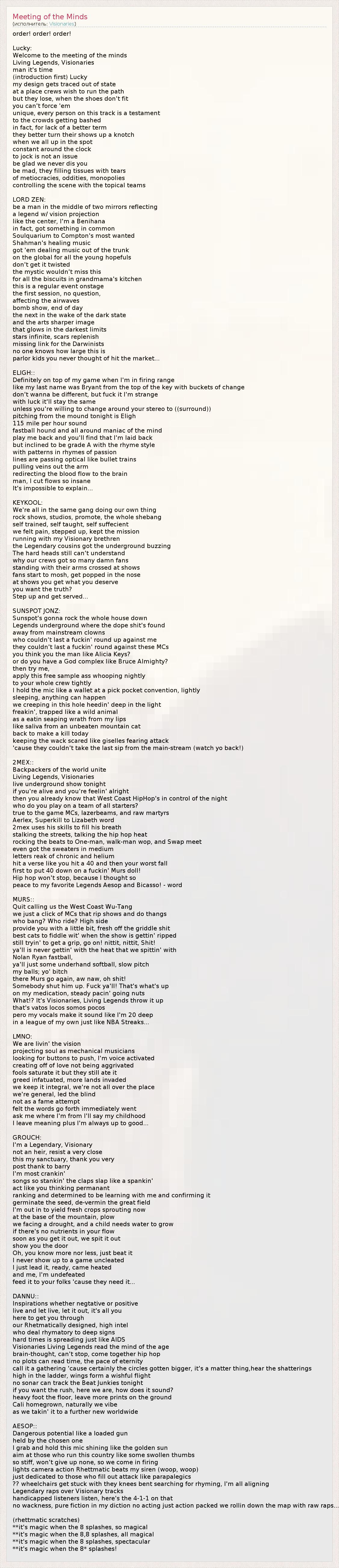 Это интересно:The Visionaries is an underground hip hop crew from Los Angeles, California. The crew formed in 1995, and have since released four full-length albums on Up Above Records. The crew's six members have collectively released over twenty solo and side projects. They have collaborated and performed with many other hip-hop artists, including Wu-Tang Clan, Nas, Common, Mos Def, Talib Kweli, Dilated Peoples, Taktloss, De La Soul, Blackalicious, Jean Grae, Psycho Realm, Playalitical, Jay Dee aka J Dilla, and Jurassic 5. If You Can't Say Love is a single made famous by the video game Blitz: The League and is from their Pangaea album. In 2008, Visionaries' member 2Mex was featured on Grand Angel's... продолжение