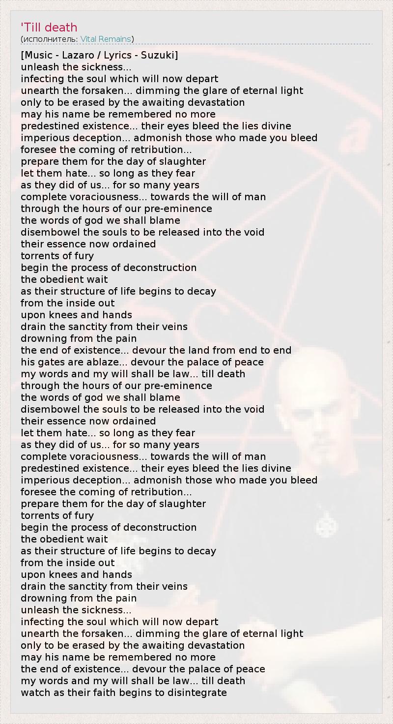 Это интересно:VITAL REMAINS был создан в состоянии восхищения морбидэнжеловского "Altars of Madness" в '89. Возросшая под влиянием таких восьмидесятнических групп, как Venom, Celtic Frost, Bathory, Mercyful Fate, Sodom и Destruction, эта банда с Род-Айленда довольно быстро стала неотъемлемой частью дэт-металлического андеграунда. Все началось в 1989, когда под флагом Vital Remains объединились пятеро жителей Провиденса: гитаристы Тони Лазаро... продолжение