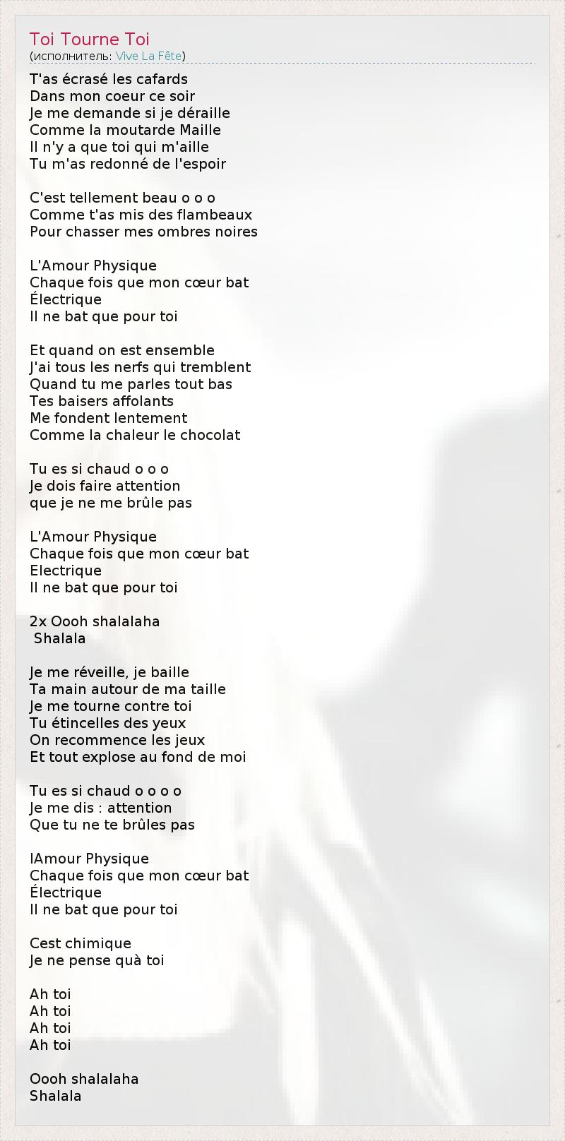 T'as écrasé ле cafards Dans Mon Coeur се Soir Je меня Demande си JE déraille Comme ла Moutarde Maille Ил N'y с дие Toi Квай m'aille Ту m'as Redonne де l' Espoir C'est Tellement денди о о о Comme t'as неправильно де Flambeaux Налейте chasser мес Ombres Noires L'Amour Телосложение Chaque фуа дие Mon Coeur летучая мышь ELECTRIQUE Ил пе битой дие залить TOI Et Quand на Est ансамбль J'ai Tous Les Nerfs Квай tremblent Quand Вт мне parles Tout барельеф Tes baisers affolants Меня fondent lentement Comme ла Chaleur ле шоколадом Tu Es си Chaud о о о Je Dois Faire внимание дие JE пе меня брюле па L'Amour Телосложение Chaque фуа дие Mon Coeur летучая мышь Electrique Ил пе битой дие залить TOI 2x Ооо shalalaha Shalala Je меня побудка , я люблю Baille Та основная Autour де ма Талии Je меня TOURNE CONTRE тои Ту étincelles де Yeux На возобновить ле Jeux Et рекламируют взорваться а.е. любят де Moi Tu Es си Chaud о о о о Je меня рас : внимание Que Tu пе те brûles па Ламур Телосложение Chaque фуа дие Mon Coeur летучая мышь ELECTRIQUE Ил пе битой дие залить TOI Cest CHIMIQUE Je пе Pense условием тои Ах тои Ах тои Ах тои Ах тои Ооо shalalaha Shalala