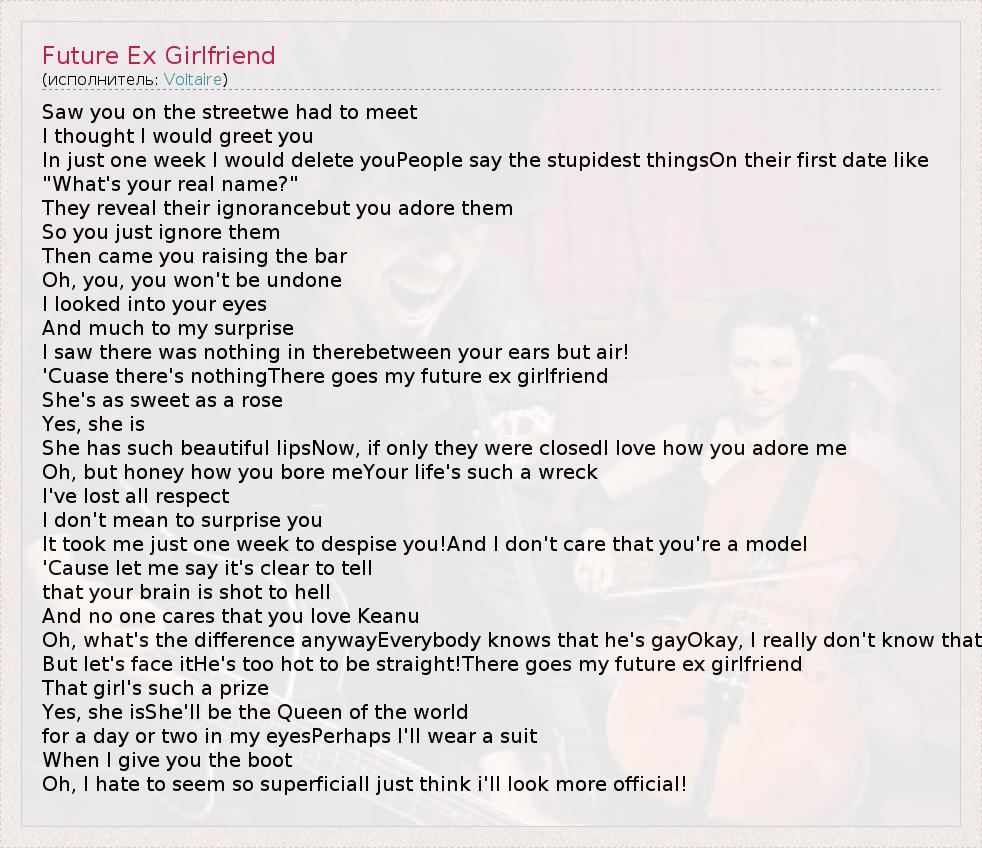 А как ты думаешь, о чем песня "Future Ex Girlfriend" ?