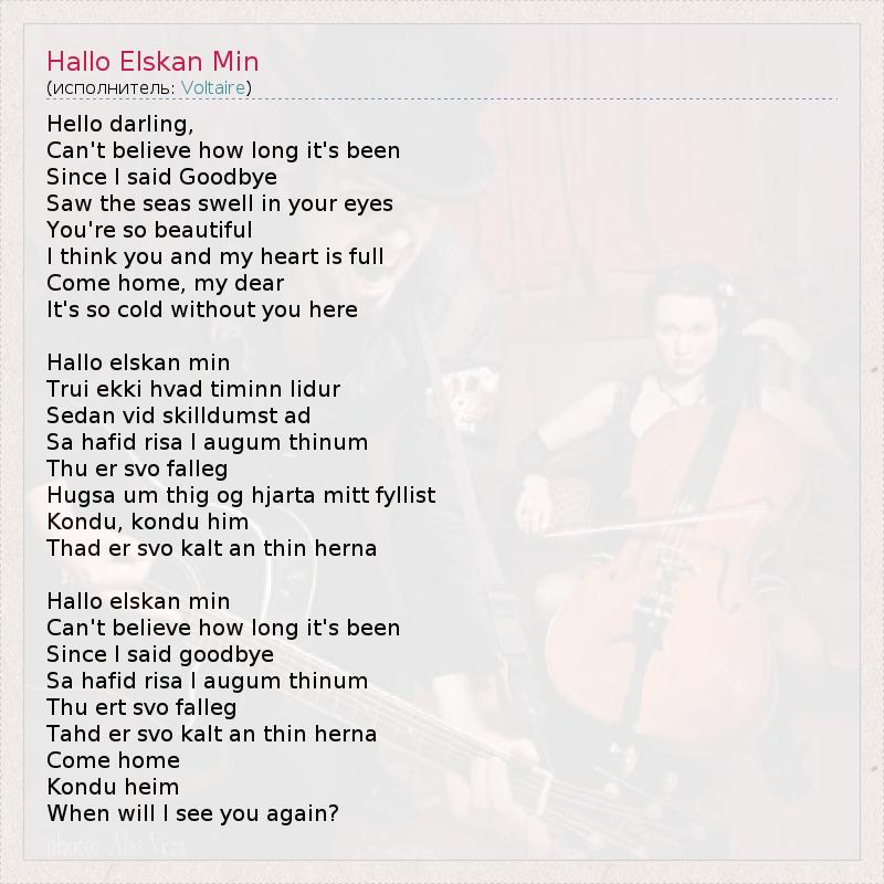 Hello darling, Can't believe how long it's been Since I said Goodbye Saw the seas swell in your eyes You're so beautiful I think you and my heart is full Come home, my dear It's so cold without you here Hallo elskan min Trui ekki hvad timinn lidur Sedan vid skilldumst ad Sa hafid risa I augum thinum Thu er svo falleg Hugsa um thig og hjarta mitt fyllist Kondu, kondu him Thad er svo kalt an thin herna Hallo elskan min Can't believe how long it's been Since I said goodbye Sa hafid risa I augum thinum Thu ert svo falleg Tahd er svo kalt an thin herna Come home Kondu heim When will I see you again?