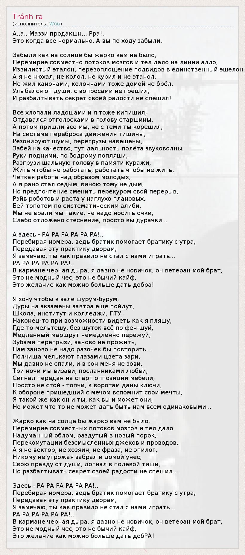 А..а.. Маззи продакшн... Рра!.. Это когда все нормально. А вы по ходу забыли.. Забыли как на солнце бы жарко вам не было, Перемирие совместно потоков мозгов и тел дало на линии алло, Извилистый эталон, перевоплощение подвидов в единственный эшелон, А я не нюхал, не колол, не курил и не этанол, Не жил канонами, колоннами тоже домой не брёл, Улыбался от души, с вопросами не грешил, И разбалтывать секрет своей радости не спешил! Все хлопали ладошами и я тоже кипишил, Отдавался отголосками в голову старшины, А потом пришли все мы, не с теми ты корешил, На системе переброса движения тишины, Резонируют шумы, перегрузы навешены, Забей на качество, тут дальность полёта звуковолны, Руки подними, по бодрому попляши, Разгрузи шальную голову в памяти куражи, Жить чтобы не работать, работать чтобы не жить, Четкая работа над образом молодых, А я рано стал седым, виною тому не дым, Но предпочтение сменить перекуром свой перерыв, Рэйв роботов и раста у наглухо плановых, Бей топотом по систематическим алиби, Мы не врали мы такие, не надо носить очки, Слабо отложено стеснение, просто вы дурачки... А здесь - РА РА РА РА РА РА!.. Перебирая номера, ведь братик помогает братику с утра, Передавая эту практику дворам, Я замечаю, ты как правило не стал с нами играть... РА РА РА РА РА РА!.. В кармане черная дыра, я давно не новичок, он ветеран мой брат, Это не модный чес, это не бычий кайф, Это желание как можно больше дать добра! Я хочу чтобы в зале шурум-бурум, Дуры на экзамены завтра ещё пойдут, Школа, институт и колледжи, ПТУ, Наконец-то при возможности видеть как я пляшу, Где-то мельтешу, без шуток всё по фен-шуй, Медленный маршрут немедленно пережуй, Зубами перегрызи, заново не прожить, Нам заново не надо разочек бы повторить... Полчища мелькают глазами цвета зари, Мы давно не спали, и в сон меня не зови, Три ночи мы визави, посланниками любви, Сигнал передан на старт оппозиции мебели, Просто не стой - топчи, к воротам даны ключи, К обороне пришедший с мечом вспомнит свои мечты, Я такой же как он и ты, как вы и может они, Но может что-то не может дать быть нам всем одинаковыми... Жарко как на солце бы жарко вам не было, Перемирие совместных потоков мозгов и тел дало Надуманный облом, раздутый в новый порок, Перекомутации безсмысленных джеков и проводов, А я не вектор, не хозяин, не фраза, не эпилог, Никому не угрожая забрал и домой унес, Свою правду от души, догнал в полевой тиши, Но разбалтывать секрет своей радости не спешил... Здесь - РА РА РА РА РА РА!.. Перебирая номера, ведь братик помогает братику с утра, Передавая эту практику дворам, Я замечаю, ты как правило не стал с нами играть... РА РА РА РА РА РА!.. В кармане черная дыра, я давно не новичок, он ветеран мой брат, Это не модный чес, это не бычий кайф, Это желание как можно больше дать добРА!