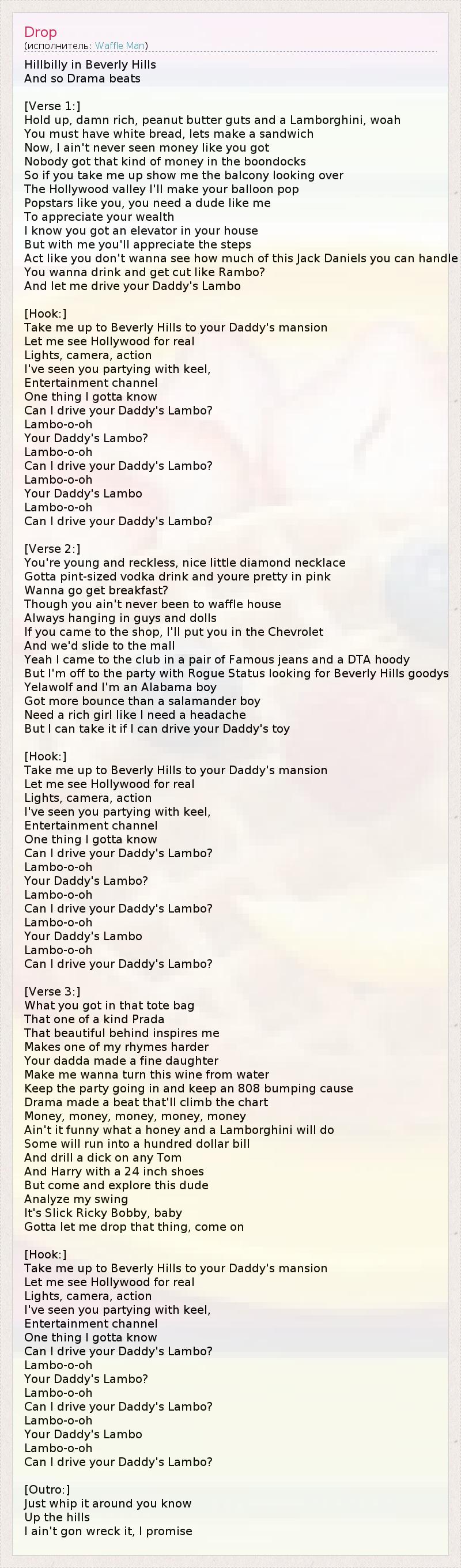 Как там у вас в Беверли-Хиллз 1? Так Drama beats 2 [Куплет 1:] Постой, чертовски богатая, коричневые кожаные сиденья вместе с ламборджини, вау! У вас наверняка есть белый хлеб, давай сделаем сэндвич 3! Я никогда не видел такого количества денег, сколько у вас, В моём захолустье нет богачей с такими богатствами. Поэтому, если ты покажешь мне вид с балкона На Голливудскую долину 4, то я отра*аю тебя! Звёздам наподобие тебя, нужен парень типа меня, Что бы оценивать твоё богатство. Я знаю, что у тебя в доме есть лифт, Но со мной ты начнешь ценить ступеньки! Ведешь себя, будто тебе не интересно, сколько Jack Daniels 5 в тебя вольется, Хочешь ли ты напиться и потра*аться как с Рембо? И позволить мне покататься на Лабмо 6 твоего папы! [Припев:] Возьми меня в Беверли-Хиллз - в особняк твоего папаши, Позволь увидеть каков Голливуд по-настоящему... "Свет, камера, мотор"! Я наблюдал, как ты отрываешься и вырываешься вперед На развлекательных каналах, Всего один ответ, который я хочу узнать! Могу ли я поводить ламборджини твоего папы? Ламбо-о-оу Ламборджини твоего папы? Ламбо-о-оу Могу ли я покататься на ламборджини твоего папы? Ламбо-о-оу Ламборджини твоего папы? Ламбо-о-оу Могу ли я погонять на ламборджини твоего папы? [Куплет 2:] Ты молода и безбашенна 7, отличное маленькое бриллиантовое колье! Должна выпить кружку водки, ты милашка в розовом 8! Хочешь пойти позавтракать 8? Ставлю, что ты никогда не была в waffle house 9, Всегда набитым парнями и куколками... Если ты собираешься за покупками, я посажу тебя в Шевроле, И мы поедим затовариваться. Ага, я пришёл в клуб, одет в сочетании модных Джинс и свитере DTA 10, Но свалил с вечеринки в одежде Rogue Status 10, присматривая цыпочек из Беверели-Хиллз! Йела-волк, и я парень с Алабамы, Я люблю оттягиваться больше, чем мальчик-саламандра! Я нуждаюсь в девушке, как в головной боли! Но я могу смириться с этим, если разрешишь погонять на игрушке твоего отца! [Припев:] Возьми меня в Беверли-Хиллз - в особняк твоего папаши, Позволь увидеть каков Голливуд по-настоящему... "Свет, камера, мотор"! Я наблюдал, как ты отрываешься и вырываешься вперед На развлекательных каналах, Всего один ответ, который я хочу узнать! Могу ли я поводить ламборджини твоего папы? Ламбо-о-оу Ламборджини твоего папы? Ламбо-о-оу Могу ли я покататься на ламборджини твоего папы? Ламбо-о-оу Ламборджини твоего папы? Ламбо-о-оу Могу ли я погонять на ламборджини твоего папы? [Куплет 3:] Что у тебя там в сумочке? Которая в единственном экземпляре Прада 11! Твоя красивая попка воодушевляет меня, Делая одну из моих рифм жестче! Твой отец вырастил великолепную дочь, Вызвал во мне желание поменять воду на вино. Вечеринка продолжается, и музыка гремит, поскольку Drama сделал бит, который поднимется в хит-парад! Деньги, деньги, деньги, деньги, деньги... Не смешно ли, что будет делать малышка с Ламборджини? Кое-кто зациклился на больших купюрах, И глубоко в неё войдет чл*н какого-нибудь Тома Или Гарри на машине с 24 дюймовыми дисками... Но иди и изучи этого парня! Исследуй мой аттракцион! Это Slick Ricky Bobby 12, детка, Ты должна разрешить мне сесть за руль, давай! [Припев:] Возьми меня в Беверли-Хиллз - в особняк твоего папаши, Позволь увидеть каков Голливуд по-настоящему... "Свет, камера, мотор"! Я наблюдал, как ты отрываешься и вырываешься вперед На развлекательных каналах, Всего один ответ, который я хочу узнать! Могу ли я поводить ламборджи