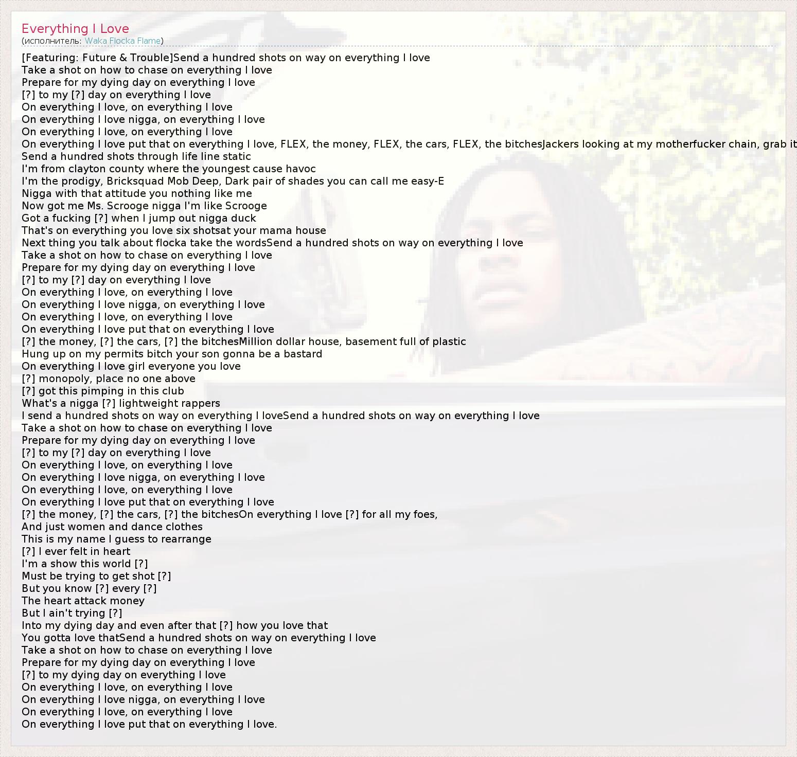Next thing you talk about flocka take the wordsSend a hundred shots on way on everything I love
