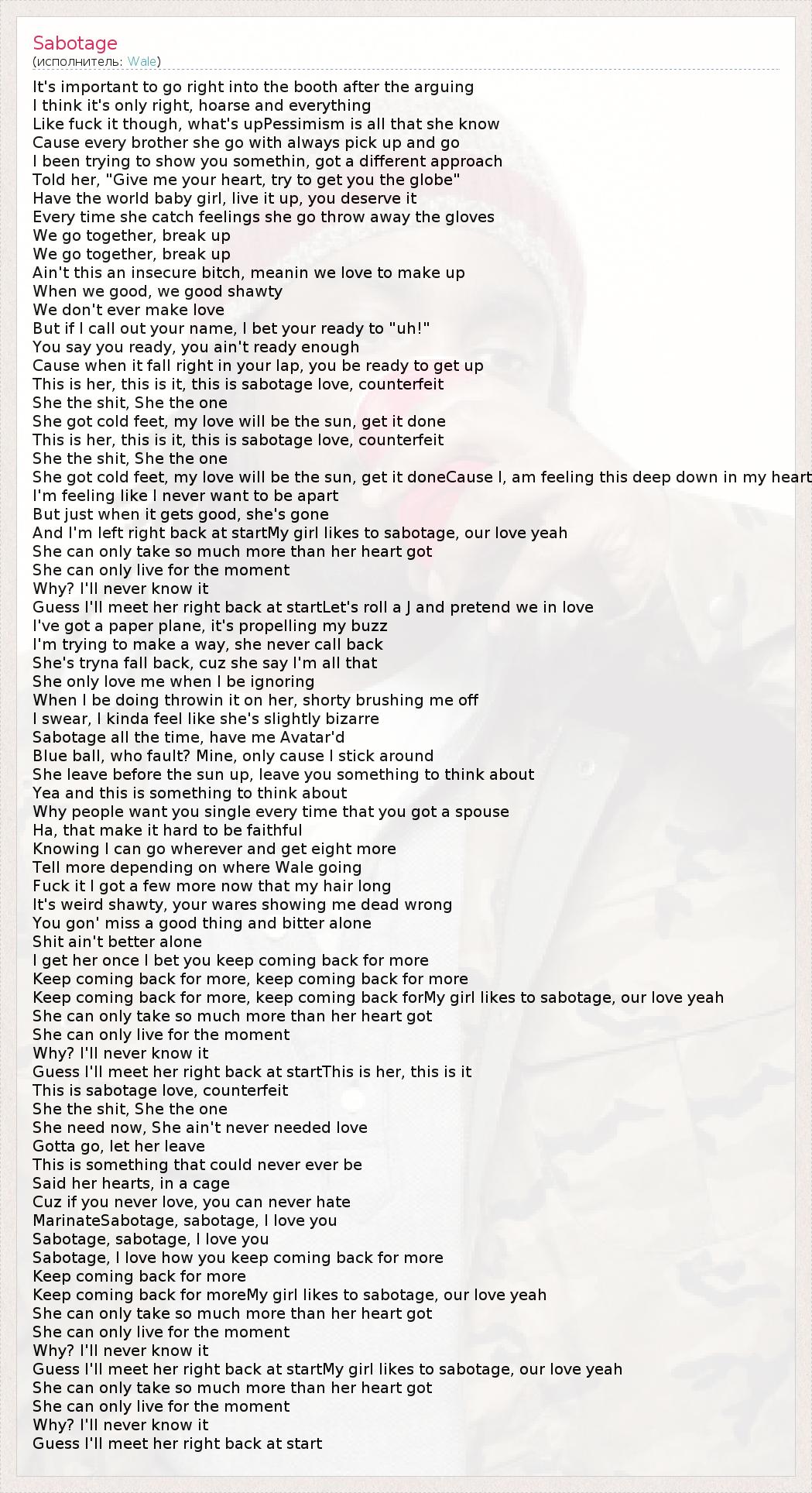 Keep coming back for more, keep coming back forMy girl likes to sabotage, our love yeah