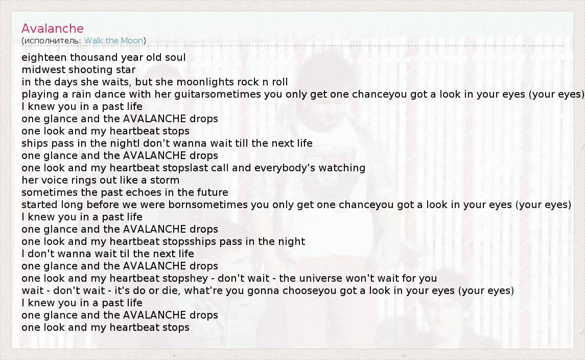Это интересно:Walk the Moon - это ребята, играющие инди-рок. Родом они из Цинциннати, Огайо. Зовут их Николас Петрикка (Nicholas Petricca), Кевин Рэй (Kevin Ray), Шон Вогаман (Sean Waugaman) и Элай Мэйман (Eli Maiman). Свой дебютный альбом, i want! i want!, парни выпустили самостоятельно в ноябре 2010-го года (песня "Anna Sun" из которого попала в ротацию на станциях WCRD, WFPK и WTMD).В феврале 2011-го Walk the Moon подписали контракт с лейблом Mick Management. Согласно... продолжение