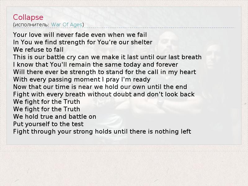 Это интересно:После развала Point Zero летом 2002-го оставшиеся члены команды быстро сколотили новый хард-кор коллектив War of Ages. Главными инициаторами создания новой группы были братья Гэмпы – Лирой и Алекс. В состав новой команды вошел бывший член христианской блэк-кор группы Mortal Treason – бас-гитарист Ти-Джей Элфорд. В 2003-м War of Ages сделали независимую запись Unite Us All EP в родном городе Эри (штат Пенсильвания),... продолжение