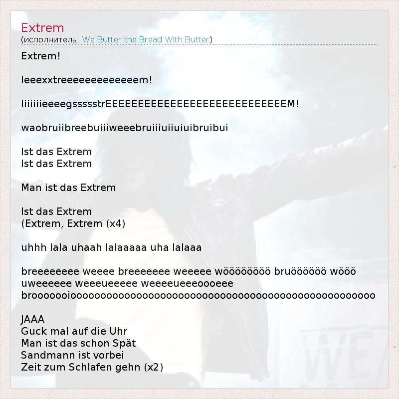 Это интересно:We Butter The Bread With Butter - это команда из немецкого города Люббен, игравшая deathcore с 8-битными электронными семплами. Изначально команда состояла из двух участников: Tobias "Tobi" Schultka (вокал) и Marcel "Marci" Neumann (гитара). Таким составом группа записала свой дебютный альбом Das Monster Aus Dem Schrank.Группа была основана в 2007 году.... продолжение