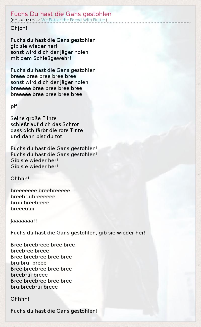 Ohjoh! Fuchs du hast die Gans gestohlen gib sie wieder her! sonst wird dich der Jäger holen mit dem Schießgewehr! Fuchs du hast die Gans gestohlen breee bree bree bree bree sonst wird dich der Jäger holen breeeee bree bree bree bree breeeee bree bree bree bree plf Seine große Flinte schießt auf dich das Schrot dass dich färbt die rote Tinte und dann bist du tot! Fuchs du hast die Gans gestohlen! Fuchs du hast die Gans gestohlen! Gib sie wieder her! Gib sie wieder her! Ohhhh! breeeeeee breebreeeee breebruibreeeeee bruii breebreee breeeuuii Jaaaaaaa!! Fuchs du hast die Gans gestohlen, gib sie wieder her! Bree breebreee bree bree breebree breee Bree breebree bree bree bruibrui breee Bree breebree bree bree breebrui breee Bree breebree bree bree bruibreebrui breee Ohhhh! Fuchs du hast die Gans gestohlen!