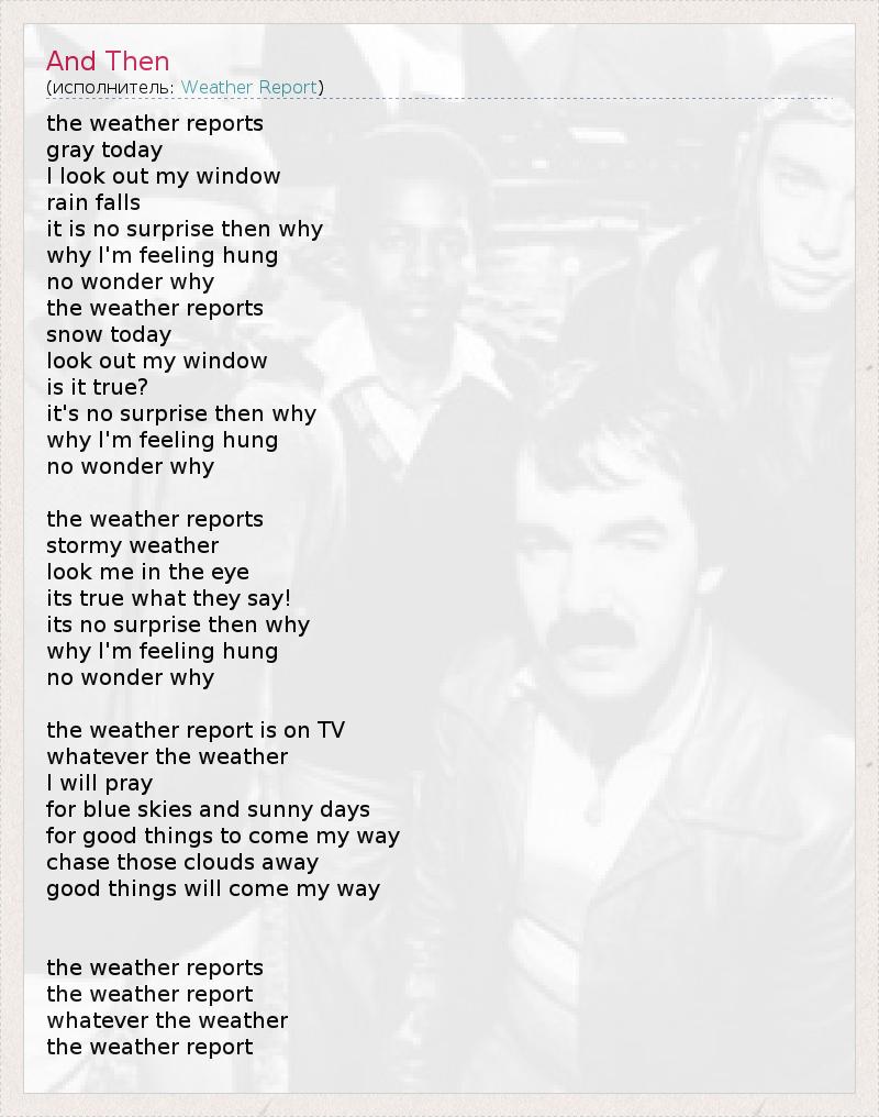Это интересно:"Weather Report" — американский джаз-фьюжн коллектив, образованный в Нью-Йорке в 1970 году и просуществовавший до 1986 года. Изначально группа была осколком коллектива Майлза Дэвиса. Ядром состава всегда был дуэт из пианиста Джо Завинула и саксофониста Уэйна Шортера, остальные музыканты часто менялись.В 1970 году Джо Завинул создаёт ансамбль Weather Report, куда приглашает уже достаточно известного... продолжение