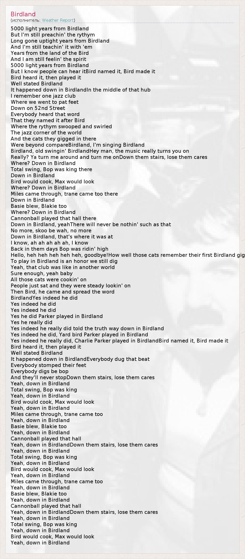 Birdland, old swingin' BirdlandHey man, the music really turns you on