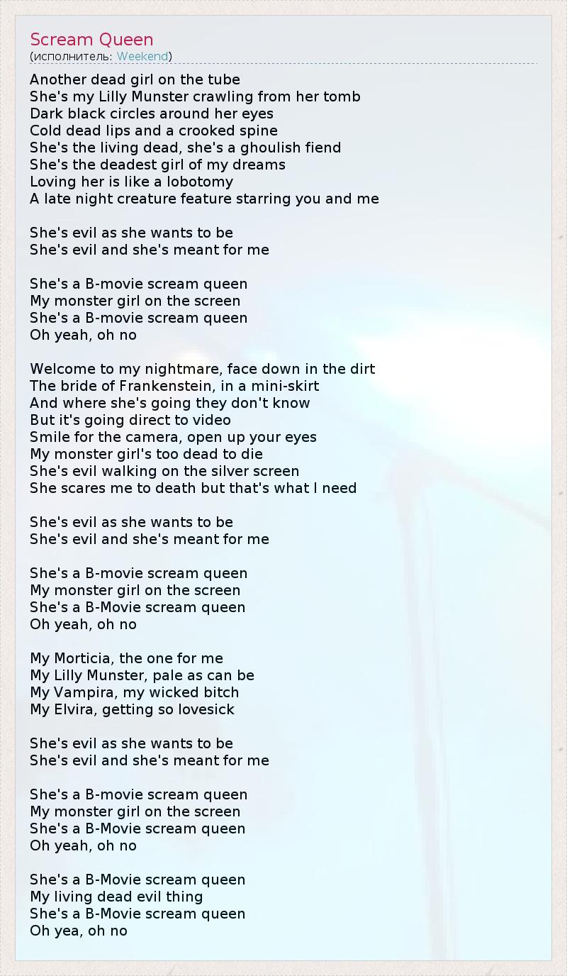 Очередная мёртвая девушка по телеку. Она - моя Лилли Мюнстер, выползающая из своей гробницы. Тёмные круги вокруг её глаз, Холодные, безжизненные губы и искривлённая спина. Она - живой мертвец, она - омерзительная злодейка. Она - самая мёртвая девушка среди моих мечтаний. Любить её - это как лоботомия. Ужастики поздней ночью, в главных ролях - ты и я. Она - само зло, и ей это нравится! Она - само зло, и она так подходит мне! Она - королева крика в дешёвом кино, Моя девочка-монстр с экрана, Она - королева крика в дешёвом кино... О, да! О, нет! Добро пожаловать в мой кошмар! Упала лицом в грязь Невеста Франкенштейна в мини-юбке, И когда она приближается, они не замечают, Но это всего лишь для видео - Улыбнись на камеру, открой глаза. Моя девочка-монстр слишком мёртвая, чтобы умереть. Она зловеще прогуливается по киноэкрану, Она пугает меня до смерти, но это как раз то, что мне нужно. Она - само зло, и ей это нравится! Она - само зло, и она так подходит мне! Она - королева крика в дешёвом кино, Моя девочка-монстр с экрана, Она - королева крика в дешёвом кино... О, да! О, нет! Моя Мортиша, единственная для меня. Моя Лилли Мюнстер, бледная насколько возможно. Моя Вампира, моя злая с*чка. Моя Эльвира, сводящая с ума от любви. Она - само зло, и ей это нравится! Она - само зло, и она так подходит мне! Она - королева крика в дешёвом кино, Моя девочка-монстр с экрана, Она - королева крика в дешёвом кино... О, да! О, нет! Она - королева крика в дешёвом кино, Моя ожившая мёртвая, само зло, Она - королева крика в дешёвом кино... О, да! О, нет!