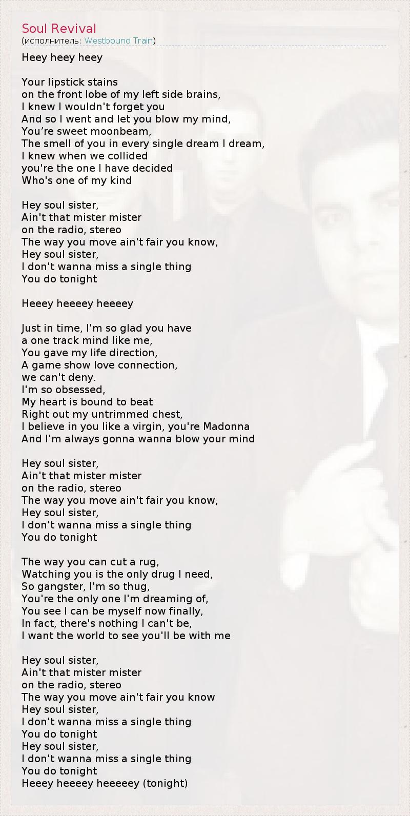 Heey heey heey Your lipstick stains on the front lobe of my left side brains, I knew I wouldn't forget you And so I went and let you blow my mind, You’re sweet moonbeam, The smell of you in every single dream I dream, I knew when we collided you're the one I have decided Who's one of my kind Hey soul sister, Ain't that mister mister on the radio, stereo The way you move ain't fair you know, Hey soul sister, I don't wanna miss a single thing You do tonight Heeey heeeey heeeey Just in time, I'm so glad you have a one track mind like me, You gave my life direction, A game show love connection, we can't deny. I'm so obsessed, My heart is bound to beat Right out my untrimmed chest, I believe in you like a virgin, you're Madonna And I'm always gonna wanna blow your mind Hey soul sister, Ain't that mister mister on the radio, stereo The way you move ain't fair you know, Hey soul sister, I don't wanna miss a single thing You do tonight The way you can cut a rug, Watching you is the only drug I need, So gangster, I'm so thug, You're the only one I'm dreaming of, You see I can be myself now finally, In fact, there's nothing I can't be, I want the world to see you'll be with me Hey soul sister, Ain't that mister mister on the radio, stereo The way you move ain't fair you know Hey soul sister, I don't wanna miss a single thing You do tonight Hey soul sister, I don't wanna miss a single thing You do tonight Heeey heeeey heeeeey (tonight)