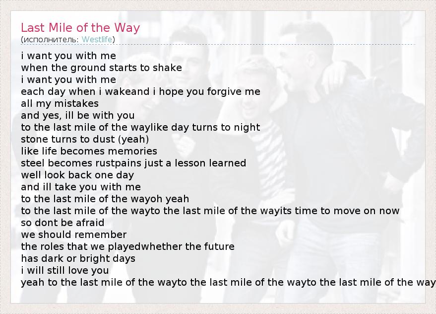 i want you with me when the ground starts to shake i want you with me each day when i wakeand i hope you forgive me all my mistakes and yes, ill be with you to the last mile of the waylike day turns to night stone turns to dust (yeah) like life becomes memories steel becomes rustpains just a lesson learned well look back one day and ill take you with me to the last mile of the wayoh yeah to the last mile of the wayto the last mile of the wayits time to move on now so dont be afraid we should remember the roles that we playedwhether the future has dark or bright days i will still love you yeah to the last mile of the wayto the last mile of the wayto the last mile of the way