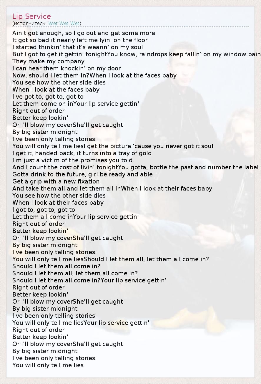 Ain't got enough, so I go out and get some more It got so bad it nearly left me lyin' on the floor I started thinkin' that it's wearin' on my soul But I got to get it gettin' tonightYou know, raindrops keep fallin' on my window pain They make my company I can hear them knockin' on my door Now, should I let them in?When I look at the faces baby You see how the other side dies When I look at the faces baby I've got to, got to, got to Let them come on inYour lip service gettin' Right out of order Better keep lookin' Or I'll blow my coverShe'll get caught By big sister midnight I've been only telling stories You will only tell me liesI get the picture 'cause you never got it soul I get it, handed back, it turns into a tray of gold I'm just a victim of the promises you told And I count the cost of livin' tonightYou gotta, bottle the past and number the label Gotta drink to the future, girl be ready and able Get a grip with a new fixation And take them all and let them all inWhen I look at their faces baby You see how the other side dies When I look at their faces baby I got to, got to, got to Let them all come inYour lip service gettin' Right out of order Better keep lookin' Or I'll blow my coverShe'll get caught By big sister midnight I've been only telling stories You will only tell me liesShould I let them all, let them all come in? Should I let them all come in? Should I let them all, let them all come in? Should I let them all come in?Your lip service gettin' Right out of order Better keep lookin' Or I'll blow my coverShe'll get caught By big sister midnight I've been only telling stories You will only tell me liesYour lip service gettin' Right out of order Better keep lookin' Or I'll blow my coverShe'll get caught By big sister midnight I've been only telling stories You will only tell me lies