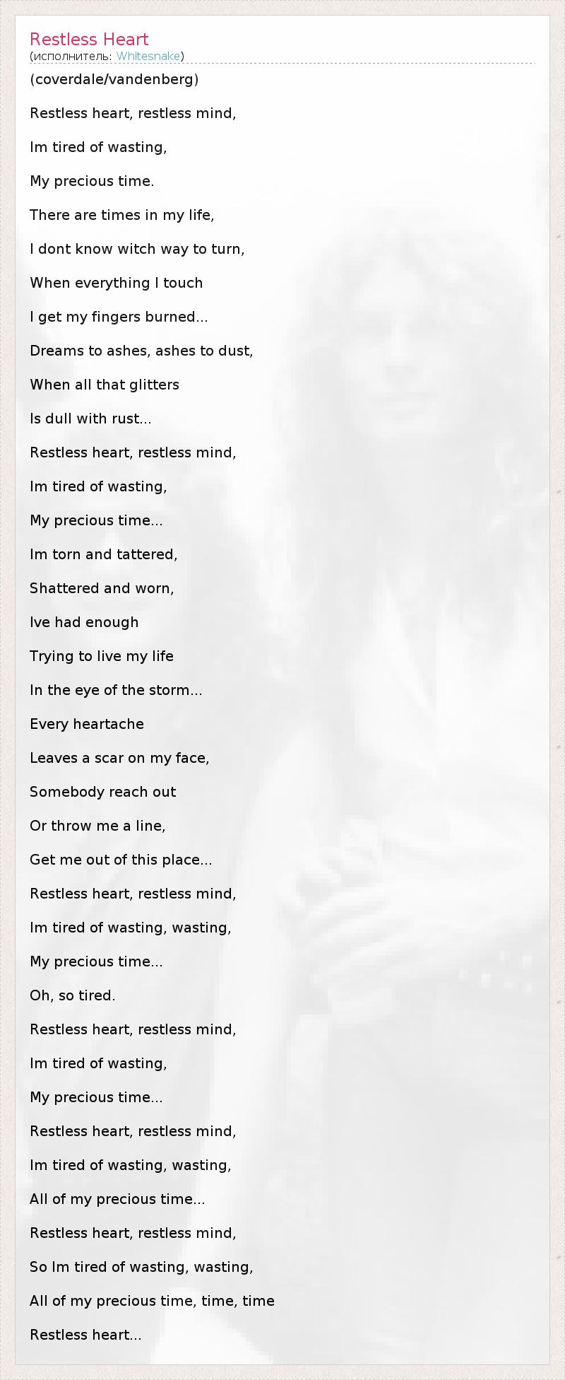 (coverdale/vandenberg) Restless heart, restless mind, Im tired of wasting, My precious time. There are times in my life, I dont know witch way to turn, When everything I touch I get my fingers burned... Dreams to ashes, ashes to dust, When all that glitters Is dull with rust... Restless heart, restless mind, Im tired of wasting, My precious time... Im torn and tattered, Shattered and worn, Ive had enough Trying to live my life In the eye of the storm... Every heartache Leaves a scar on my face, Somebody reach out Or throw me a line, Get me out of this place... Restless heart, restless mind, Im tired of wasting, wasting, My precious time... Oh, so tired. Restless heart, restless mind, Im tired of wasting, My precious time... Restless heart, restless mind, Im tired of wasting, wasting, All of my precious time... Restless heart, restless mind, So Im tired of wasting, wasting, All of my precious time, time, time Restless heart...