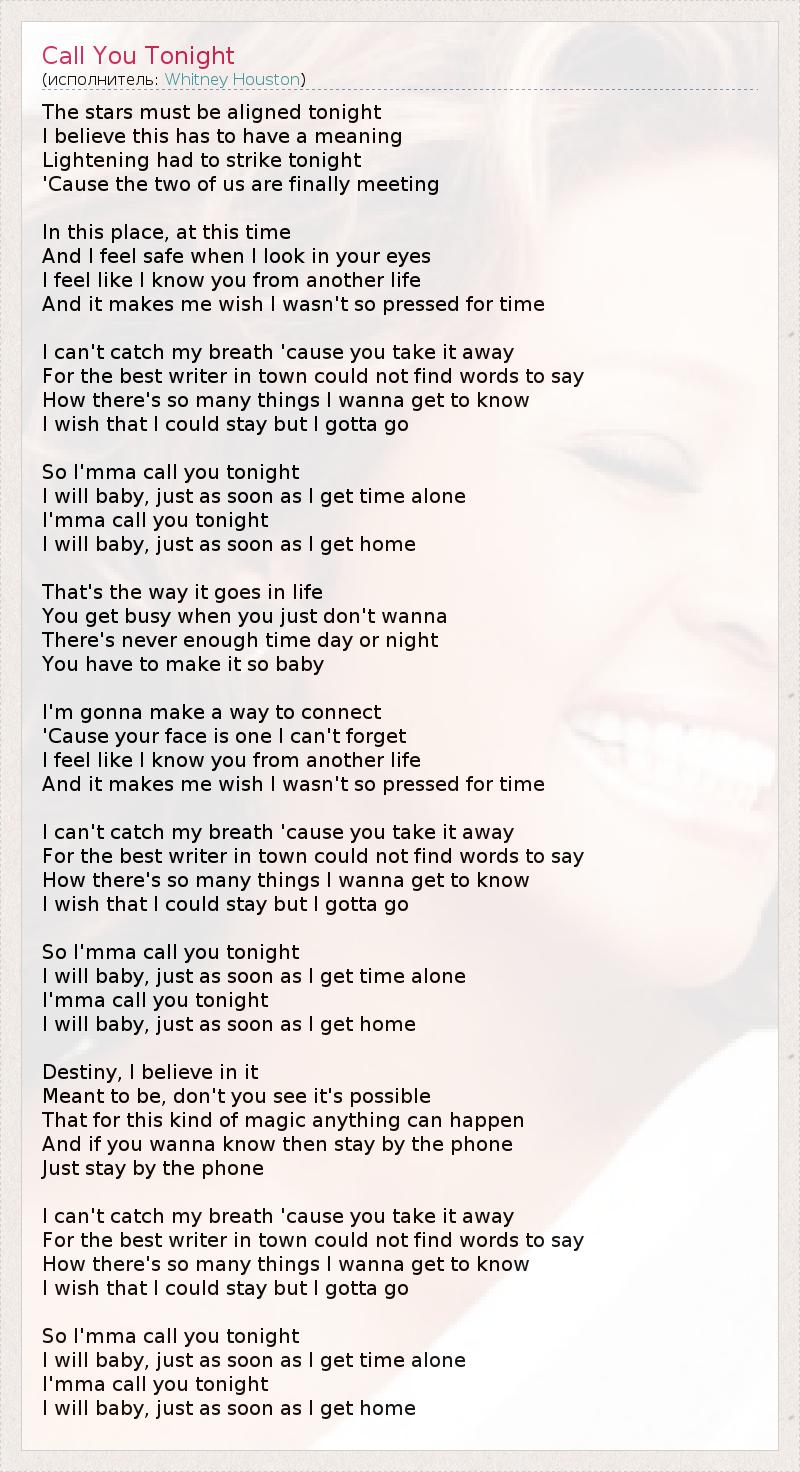 Сегодня ночью звёзды должны выстроиться в одну линию, Я верю, в этом должен быть какой-то смысл. Сегодня ночью ударила молния, Потому что двое из нас, наконец, встретились В этом месте, в это время. И я чувствую себя защищённой, утопая в твоих глазах. Такое ощущение, что я знаю тебя из прошлой жизни, И мне жаль, что время поджимает. Я не могу отдышаться, потому что ты забрал моё дыхание. Даже лучший писатель города не мог бы подобрать слов, Как много я хотела бы узнать. Я бы осталась, но мне нужно идти. Но я позвоню тебе сегодня, Позвоню, дорогой, как только буду одна. Я позвоню тебе сегодня ночью, Позвоню, дорогой, как только вернусь домой. Вот так это входит в жизнь. Ты занят, когда у тебя просто нет желания. Так никогда не будет времени, ни днём, ни ночью. Потому ты должен сделать это, дорогой. Я хочу наладить с тобой связь, Потому что твоё лицо - это единственное, что я не могу забыть. Такое ощущение, что я знаю тебя из прошлой жизни, И мне жаль, что время поджимает. Я не могу отдышаться, потому что ты забрал моё дыхание. Даже лучший писатель города не мог бы подобрать слов, Как много я хотела бы узнать. Я бы осталась, но мне нужно идти. Но я позвоню тебе сегодня, Позвоню, дорогой, как только буду одна. Я позвоню тебе сегодня ночью, Позвоню, дорогой, как только вернусь домой. Судьба, я верю в неё. Предназначение, разве не видишь, что это возможно? Для этого волшебства всё может случиться. И если ты хочешь знать это, то оставайся на связи 1, Просто оставайся на связи. Ты забрал моё дыханье, не могу дышать. Даже лучшему писателю города слов не найти, Как много мне б хотелось знать. Я бы осталась, но мне нужно идти. Но я позвоню тебе сегодня, Позвоню, дорогой, как только буду одна. Я позвоню тебе сегодня ночью, Позвоню, дорогой, когда буду дома. 1 - дословно: оставайся у телефона
