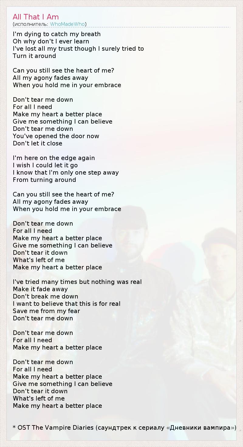 I'm dying to catch my breath Oh why don't I ever learn I've lost all my trust though I surely tried to Turn it around Can you still see the heart of me? All my agony fades away When you hold me in your embrace Don't tear me down For all I need Make my heart a better place Give me something I can believe Don't tear me down You've opened the door now Don't let it close I'm here on the edge again I wish I could let it go I know that I'm only one step away From turning around Can you still see the heart of me? All my agony fades away When you hold me in your embrace Don't tear me down For all I need Make my heart a better place Give me something I can believe Don't tear it down What's left of me Make my heart a better place I've tried many times but nothing was real Make it fade away Don't break me down I want to believe that this is for real Save me from my fear Don't tear me down Don't tear me down For all I need Make my heart a better place Don't tear me down For all I need Make my heart a better place Give me something I can believe Don't tear it down What's left of me Make my heart a better place * OST The Vampire Diaries (саундтрек к сериалу «Дневники вампира»)