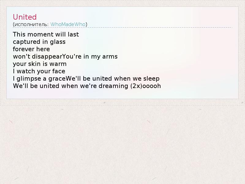This moment will last captured in glass forever here won't disappearYou're in my arms your skin is warm I watch your face I glimpse a graceWe'll be united when we sleep We'll be united when we're dreaming (2x)ooooh