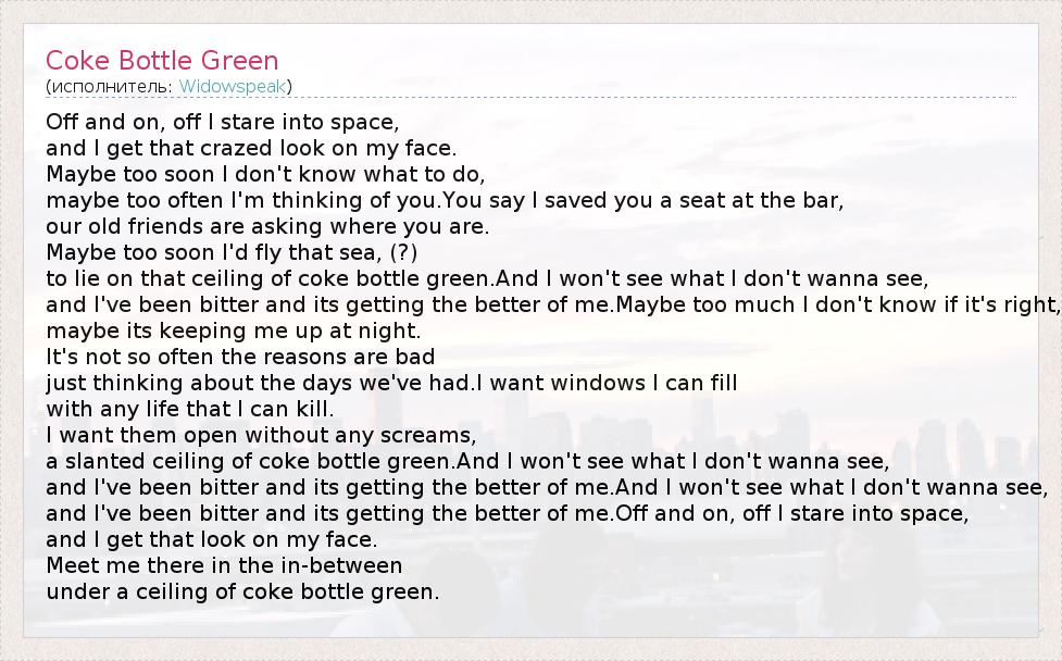 А как ты думаешь, о чем песня "Coke Bottle Green" ?