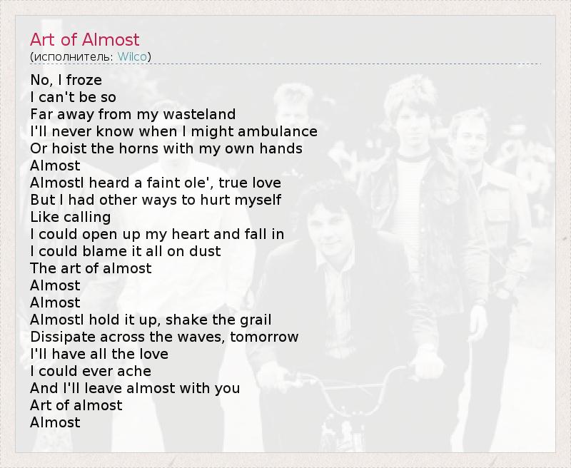 No, I froze I can't be so Far away from my wasteland I'll never know when I might ambulance Or hoist the horns with my own hands Almost AlmostI heard a faint ole', true love But I had other ways to hurt myself Like calling I could open up my heart and fall in I could blame it all on dust The art of almost Almost Almost AlmostI hold it up, shake the grail Dissipate across the waves, tomorrow I'll have all the love I could ever ache And I'll leave almost with you Art of almost Almost