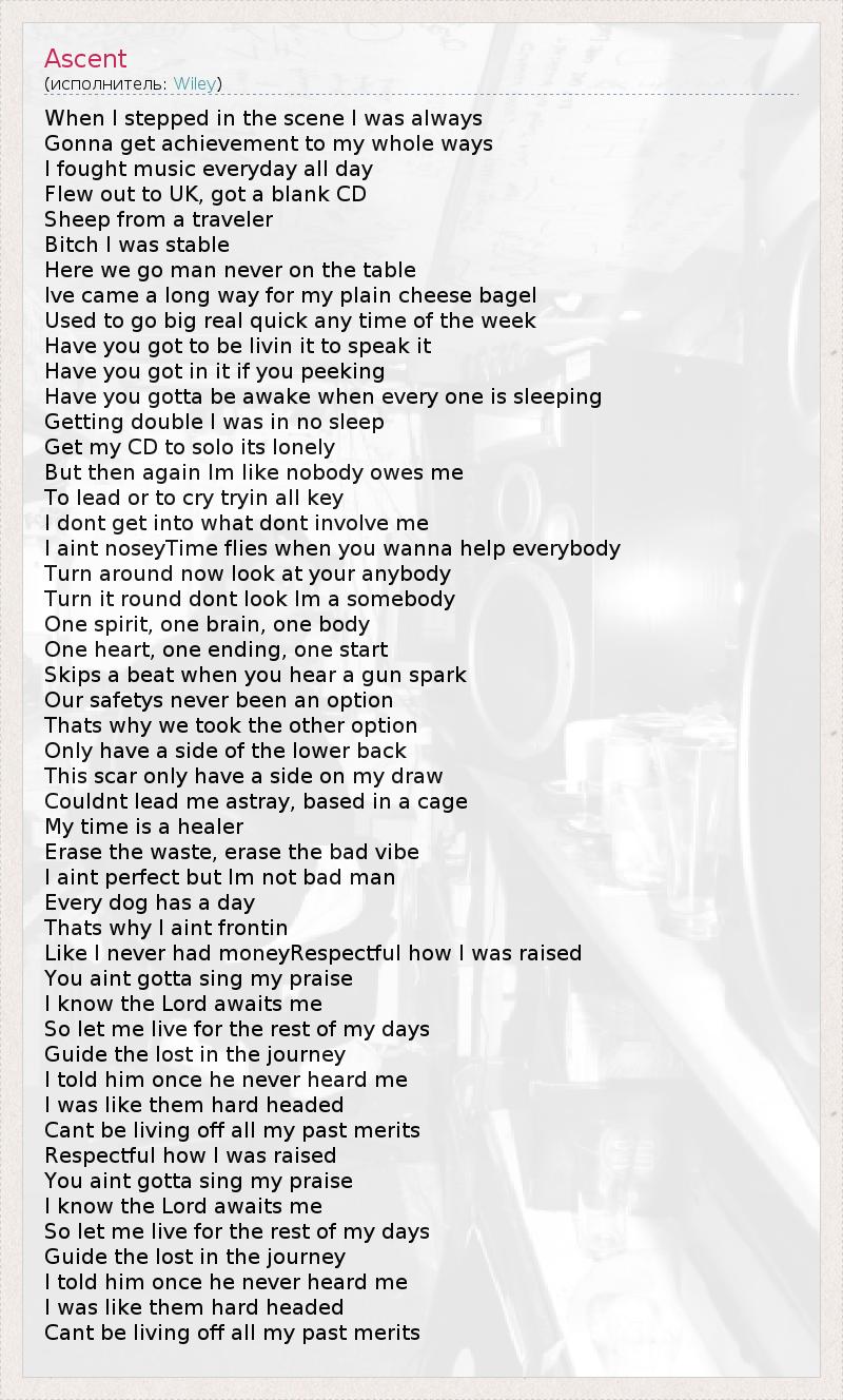 When I stepped in the scene I was always Gonna get achievement to my whole ways I fought music everyday all day Flew out to UK, got a blank CD Sheep from a traveler Bitch I was stable Here we go man never on the table Ive came a long way for my plain cheese bagel Used to go big real quick any time of the week Have you got to be livin it to speak it Have you got in it if you peeking Have you gotta be awake when every one is sleeping Getting double I was in no sleep Get my CD to solo its lonely But then again Im like nobody owes me To lead or to cry tryin all key I dont get into what dont involve me I aint noseyTime flies when you wanna help everybody Turn around now look at your anybody Turn it round dont look Im a somebody One spirit, one brain, one body One heart, one ending, one start Skips a beat when you hear a gun spark Our safetys never been an option Thats why we took the other option Only have a side of the lower back This scar only have a side on my draw Couldnt lead me astray, based in a cage My time is a healer Erase the waste, erase the bad vibe I aint perfect but Im not bad man Every dog has a day Thats why I aint frontin Like I never had moneyRespectful how I was raised You aint gotta sing my praise I know the Lord awaits me So let me live for the rest of my days Guide the lost in the journey I told him once he never heard me I was like them hard headed Cant be living off all my past merits Respectful how I was raised You aint gotta sing my praise I know the Lord awaits me So let me live for the rest of my days Guide the lost in the journey I told him once he never heard me I was like them hard headed Cant be living off all my past merits