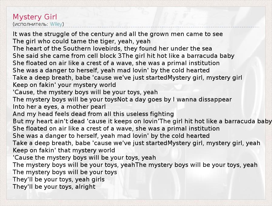 А как ты думаешь, о чем песня "Mystery Girl" ?