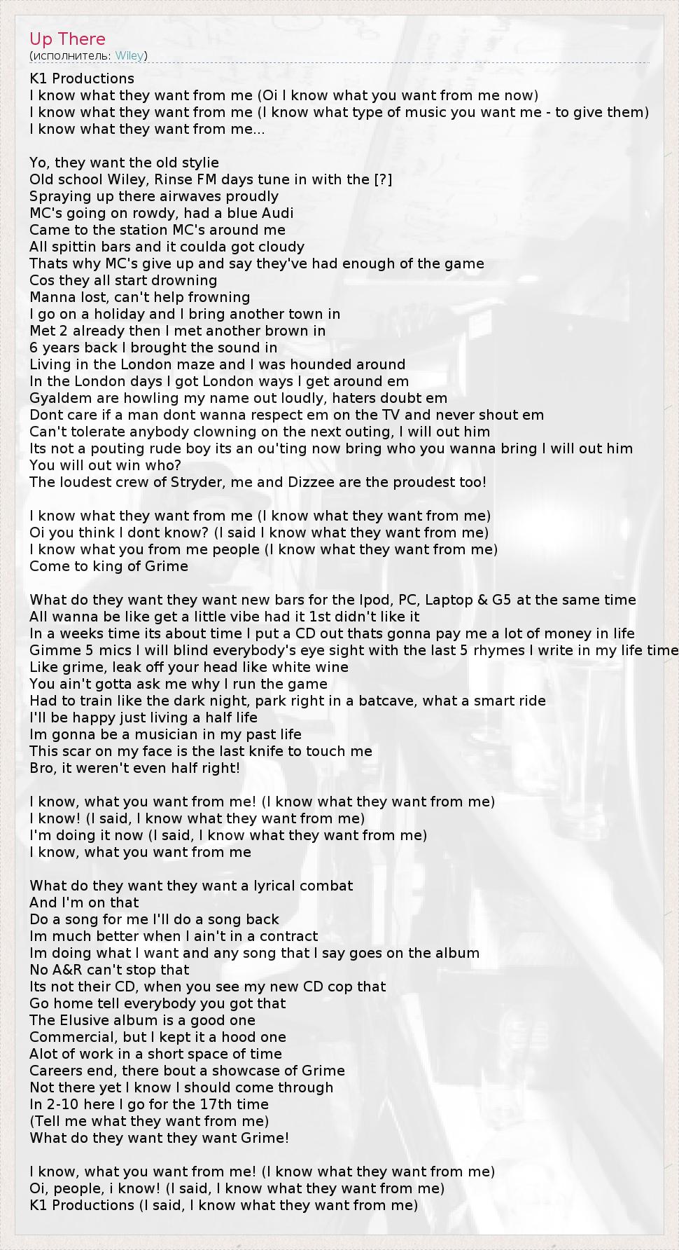 Это интересно:Wiley, также известный как Eskiboy (настоящее имя Richard Kylea Cowie, родился 19 января 1979г.) — МС и продюсер из Bow E3 (район Восточного Лондона). Wiley стал одним из основоположников такого жанра, как Grime, а также создал собственный стиль или поджанр, который он назвал "Eskibeat". Трек "Eskimo", из которого и берет название стиль, наверное, самый известный Eskibeat трек. Wiley помог начать музыкальную карьеру многим... продолжение