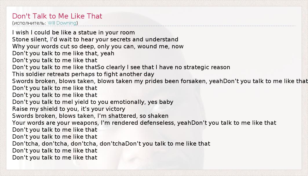 I wish I could be like a statue in your room Stone silent, I'd wait to hear your secrets and understand Why your words cut so deep, only you can, wound me, now Don't you talk to me like that, yeah Don't you talk to me like that Don't you talk to me like thatSo clearly I see that I have no strategic reason This soldier retreats perhaps to fight another day Swords broken, blows taken, blows taken my prides been forsaken, yeahDon't you talk to me like that Don't you talk to me like that Don't you talk to me like that Don't you talk to meI yield to you emotionally, yes baby Raise my shield to you, it's your victory Swords broken, blows taken, I'm shattered, so shaken Your words are your weapons, I'm rendered defenseless, yeahDon't you talk to me like that Don't you talk to me like that Don't you talk to me like that Don'tcha, don'tcha, don'tcha, don'tchaDon't you talk to me like that Don't you talk to me like that Don't you talk to me like that
