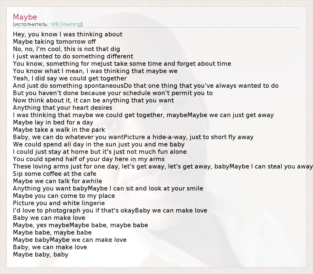 Hey, you know I was thinking about Maybe taking tomorrow off No, no, I'm cool, this is not that dig I just wanted to do something different You know, something for meJust take some time and forget about time You know what I mean, I was thinking that maybe we Yeah, I did say we could get together And just do something spontaneousDo that one thing that you've always wanted to do But you haven't done because your schedule won't permit you to Now think about it, it can be anything that you want Anything that your heart desires I was thinking that maybe we could get together, maybeMaybe we can just get away Maybe lay in bed for a day Maybe take a walk in the park Baby, we can do whatever you wantPicture a hide-a-way, just to short fly away We could spend all day in the sun just you and me baby I could just stay at home but it's just not much fun alone You could spend half of your day here in my arms These loving arms just for one day, let's get away, let's get away, babyMaybe I can steal you away Sip some coffee at the cafe Maybe we can talk for awhile Anything you want babyMaybe I can sit and look at your smile Maybe you can come to my place Picture you and white lingerie I'd love to photograph you if that's okayBaby we can make love Baby we can make love Maybe, yes maybeMaybe babe, maybe babe Maybe babe, maybe babe Maybe babyMaybe we can make love Baby, we can make love Maybe baby, baby
