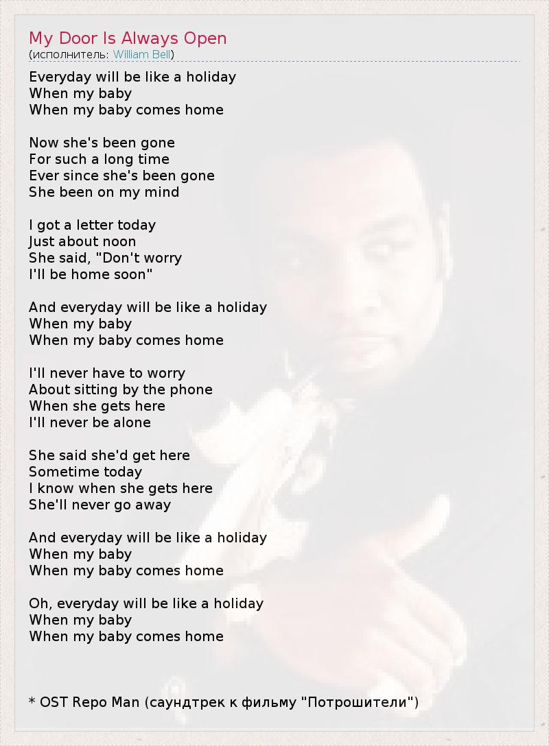 Everyday will be like a holiday When my baby When my baby comes home Now she's been gone For such a long time Ever since she's been gone She been on my mind I got a letter today Just about noon She said, "Don't worry I'll be home soon" And everyday will be like a holiday When my baby When my baby comes home I'll never have to worry About sitting by the phone When she gets here I'll never be alone She said she'd get here Sometime today I know when she gets here She'll never go away And everyday will be like a holiday When my baby When my baby comes home Oh, everyday will be like a holiday When my baby When my baby comes home * OST Repo Man (саундтрек к фильму "Потрошители")