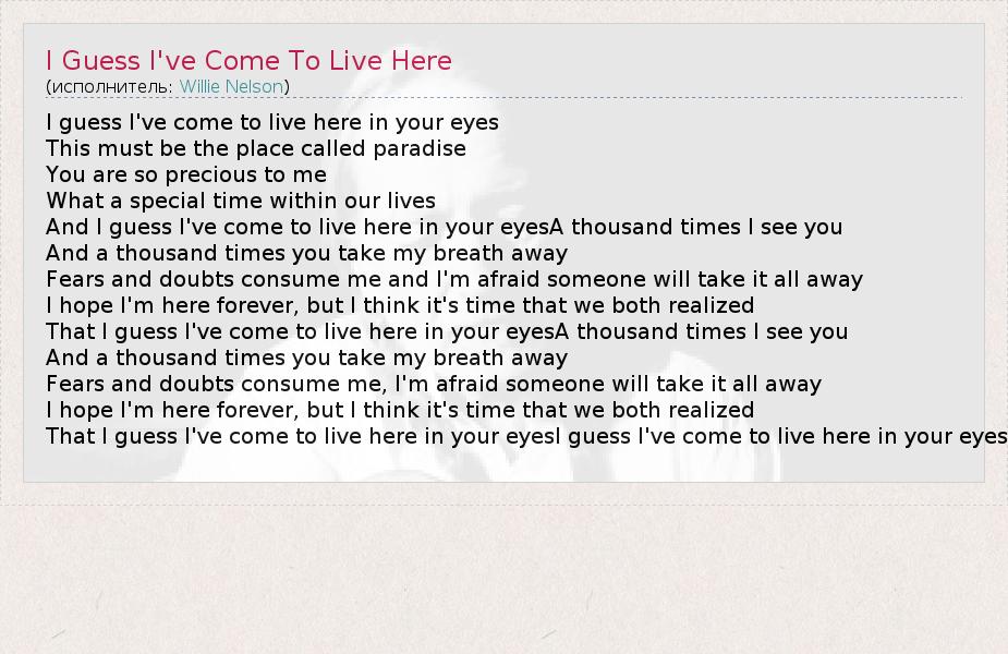 That I guess I've come to live here in your eyesI guess I've come to live here in your eyes