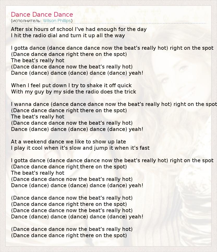 After six hours of school I've had enough for the day I hit the radio dial and turn it up all the way I gotta dance (dance dance dance now the beat's really hot) right on the spot (Dance dance dance right there on the spot) The beat's really hot (Dance dance dance now the beat's really hot) Dance (dance) dance (dance) dance (dance) yeah! When I feel put down I try to shake it off quick With my guy by my side the radio does the trick I wanna dance (dance dance dance now the beat's really hot) right on the spot (Dance dance dance right there on the spot) The beat's really hot (Dance dance dance now the beat's really hot) Dance (dance) dance (dance) dance (dance) yeah! At a weekend dance we like to show up late I play it cool when it's slow and jump it when it's fast I gotta dance (dance dance dance now the beat's really hot) right on the spot (Dance dance dance right there on the spot) The beat's really hot (Dance dance dance now the beat's really hot) Dance (dance) dance (dance) dance (dance) yeah! (Dance dance dance now the beat's really hot) (Dance dance dance right there on the spot) (Dance dance dance now the beat's really hot) Dance (dance) dance (dance) dance (dance) yeah! (Dance dance dance now the beat's really hot) (Dance dance dance right there on the spot)