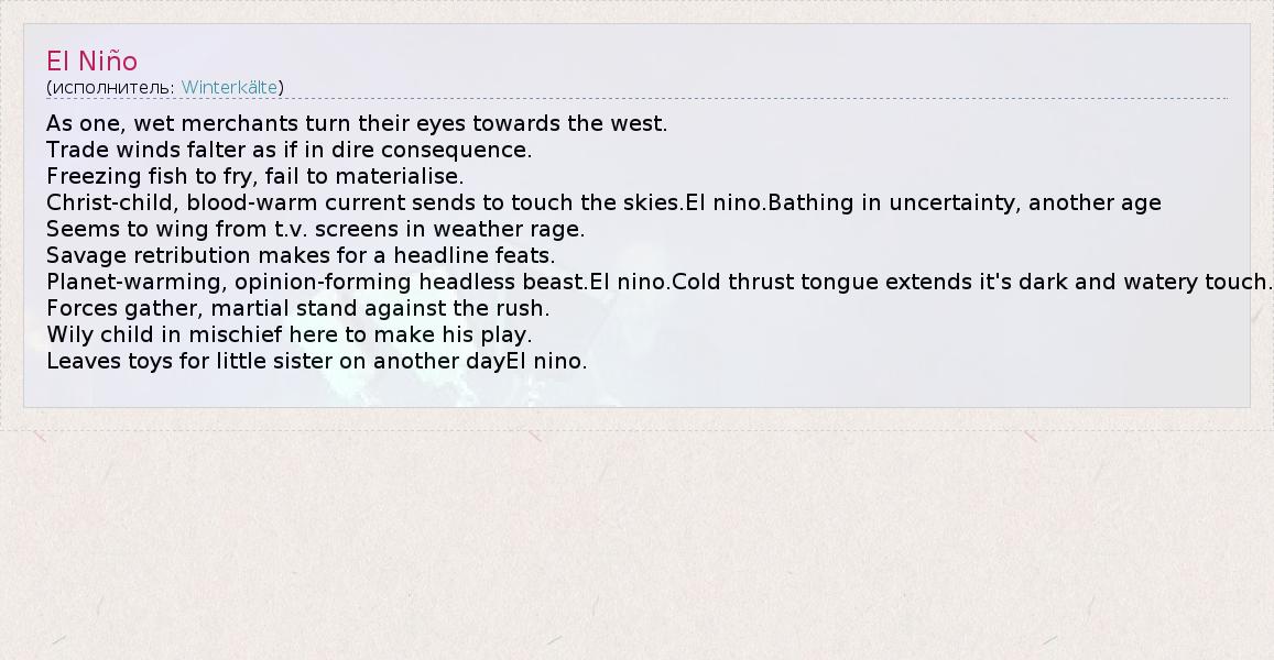 Это интересно:Немецкий проект Winterkälte, основанный Удо Виссманном в 1991 году, является одним из родоначальников стиля Distorted Beat, зародившегося как ответ индустриальной сцены на коммерческую клубную музыку, господство на танцполе транса и хауса и гламуризацию электронной культуры. Вместе с такими ставшими ныне культовыми проектами, как Asche, P.A.L., Imminent... продолжение