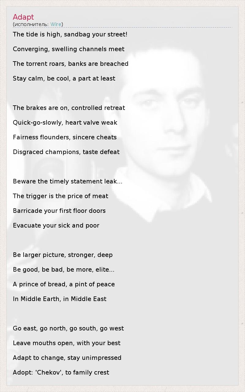 The tide is high, sandbag your street! Converging, swelling channels meet The torrent roars, banks are breached Stay calm, be cool, a part at least The brakes are on, controlled retreat Quick-go-slowly, heart valve weak Fairness flounders, sincere cheats Disgraced champions, taste defeat Beware the timely statement leak... The trigger is the price of meat Barricade your first floor doors Evacuate your sick and poor Be larger picture, stronger, deep Be good, be bad, be more, elite... A prince of bread, a pint of peace In Middle Earth, in Middle East Go east, go north, go south, go west Leave mouths open, with your best Adapt to change, stay unimpressed Adopt: 'Chekov', to family crest
