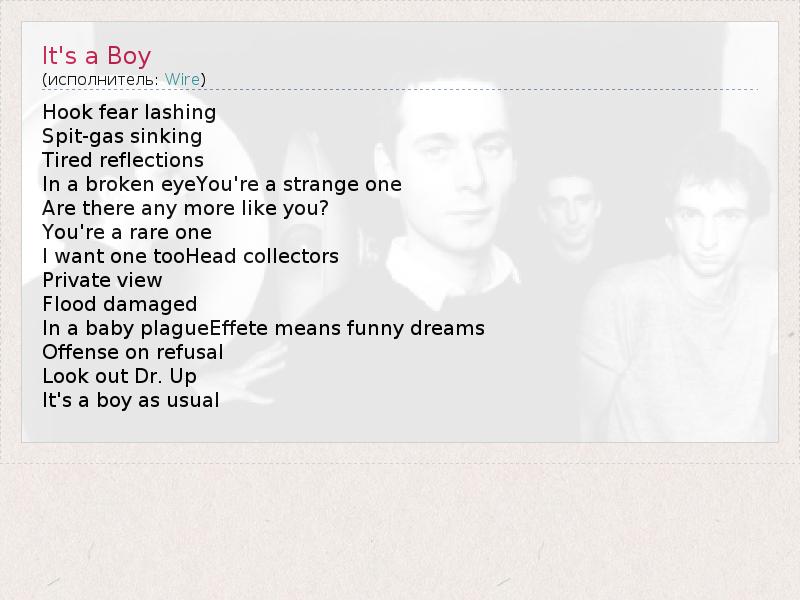 Hook fear lashing Spit-gas sinking Tired reflections In a broken eyeYou're a strange one Are there any more like you? You're a rare one I want one tooHead collectors Private view Flood damaged In a baby plagueEffete means funny dreams Offense on refusal Look out Dr. Up It's a boy as usual