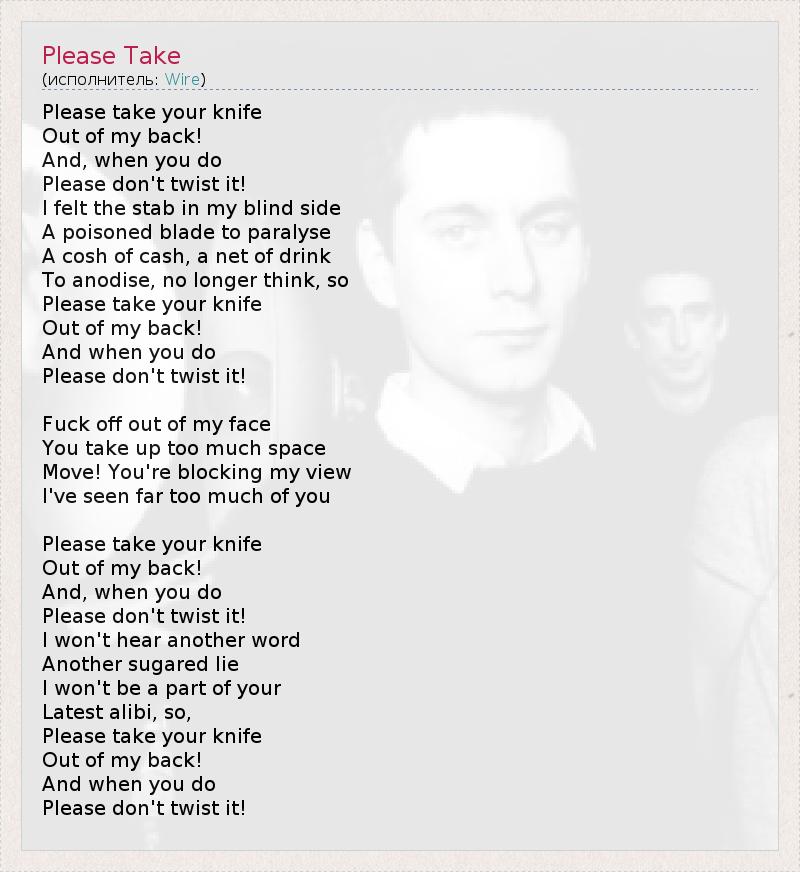 Please take your knife Out of my back! And, when you do Please don't twist it! I felt the stab in my blind side A poisoned blade to paralyse A cosh of cash, a net of drink To anodise, no longer think, so Please take your knife Out of my back! And when you do Please don't twist it! Fuck off out of my face You take up too much space Move! You're blocking my view I've seen far too much of you Please take your knife Out of my back! And, when you do Please don't twist it! I won't hear another word Another sugared lie I won't be a part of your Latest alibi, so, Please take your knife Out of my back! And when you do Please don't twist it!